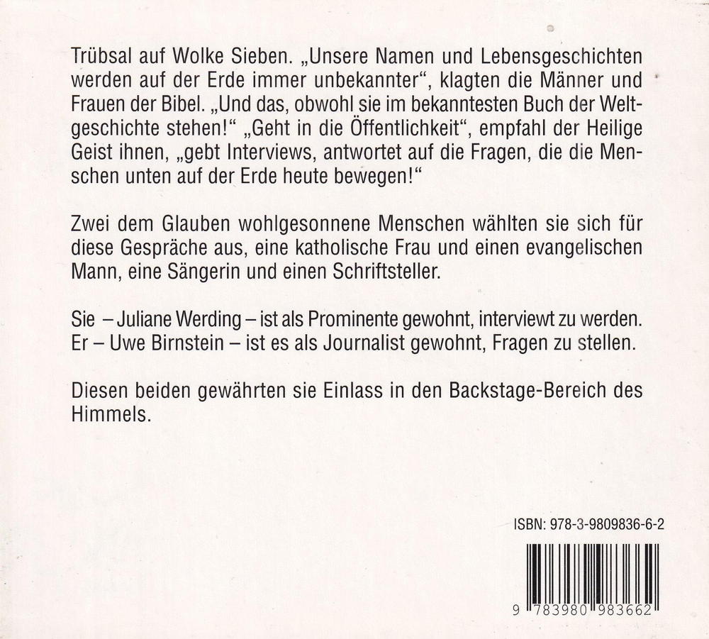 Trübsal auf Wolke Sieben. „Unsere Namen und Lebensgeschichten werden auf der Erde immer unbekannter“,klagten die Männer und Frauen der Bibel. „Und das, obwohl sie im bekanntesten Buch der Weltgeschichte stehen!“„Geht in die Öffentlichkeit“,empfahl der Heilige Geist ihnen, „gebt Interviews, antwortet auf die Fragen, die die Menschen unten auf der Erde heute bewegen!“ Zwei dem Glauben wohlgesonnene Menschen wählten sie sich für diese Gespräche aus, eine katholische Frau und einen evangelischen Mann, eine Sängerin und einen Schriftsteller. Sie – Juliane Werding- ist als Prominente gewohnt, interviewt zu werden. Er – Uwe Birnstein – ist es als Journalist gewohnt, Fragen zu stellen. Diesen beiden gewährten sie Einlass in den Backstage-Bereich des Himmels.