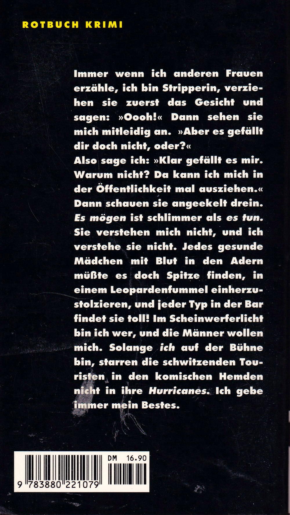 Immer wenn ich anderen Frauen erzähle, ich bin Stripperin, verziehen sie zverst das Gesicht und sagen: Oooh! Dann sehen sie mich mitleidig an. Aber es gefällt dir doch nicht, oder? Also sage ich: Klar gefällt es mir. Warum nicht? Da kann ich mich in der Öffentlichkeit mal ausziehen. Dann schauen sie angeekelt drein. Es mögen ist schlimmer als es tun. Sie verstehen mich nicht, und ich verstehe sie nicht. Jedes gesunde Mädchen mit Blut in den Adern müsste es doch Spitze finden, in einem Leopardenfummel einherzustolzieren, und jeder Typ in der Bar findet sie toll! Im Scheinwerferlicht bin ich wer, und die Männer wollen mich. Solange ich auf der Bühne bin, starren die schwitzenden Touristen in den komischen Hemden nicht in ihre Hurricanes. Ich gebe immer mein Bestes.