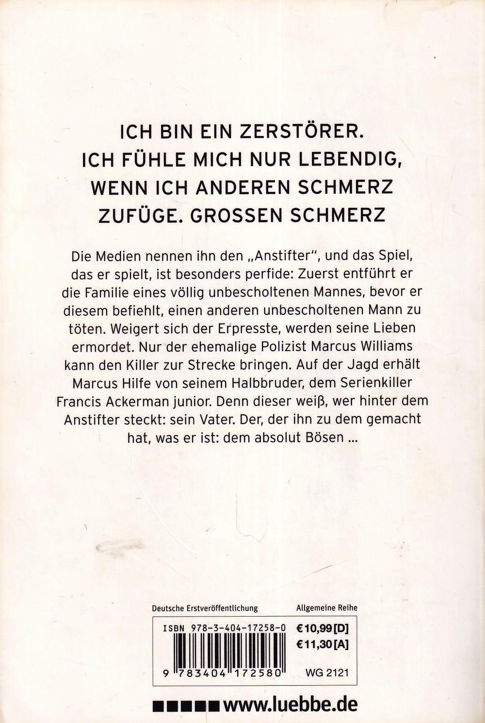 Die Medien nennen ihn den "Anstifter", und das Spiel, das er spielt, ist besonders perfide: Zuerst entführt er die Familie eines völlig unbescholtenen Mannes, bevor er diesem befiehlt, einen anderen unbescholtenen Mann zu töten. Weigert sich der Erpresste, werden seine Lieben zerstückelt. Nur die Shepherd Organization kann den Killer zur Strecke bringen. Auf der Jagd erhalten Marcus Williams und sein Team Hilfe von Marcus' Bruder, dem Serienkiller Francis Ackerman jr. Denn dieser weiss, wer hinter dem Anstifter steckt: sein Vater. Der, der ihn zu dem gemacht hat, was er ist: dem absolut Bösen ...