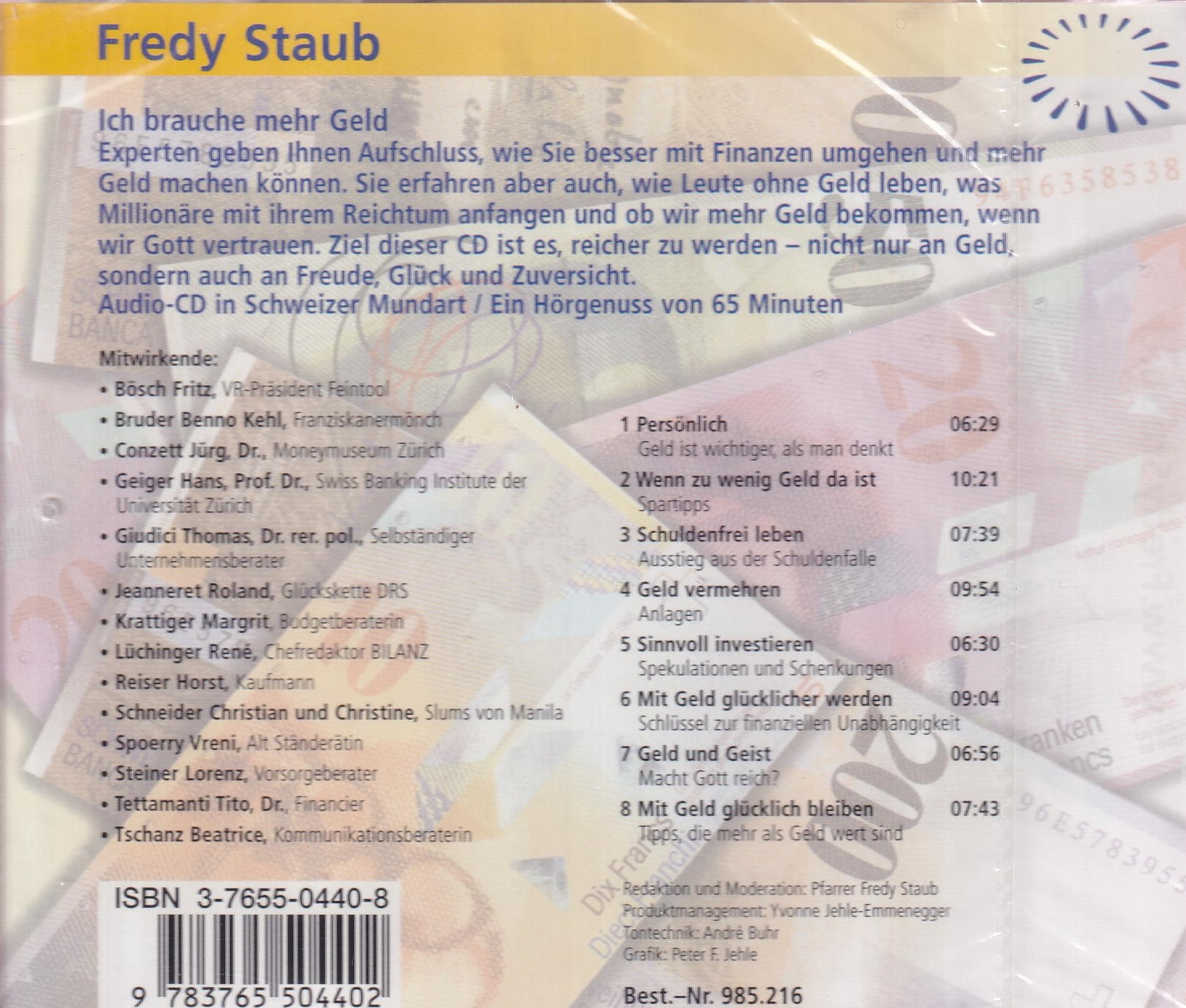 Experten geben Ihnen Aufschluss, wie Sie besser mit Finanzen umgehen und mehr Geld machen können. Sie erfahren aber auch, wie Leute ohne Geld leben, was F63 Millionäre mit ihrem Reichtum anfangen und ob wir mehr Geld bekommen, wenn wir Gott vertrauen. Ziel dieser CD ist es, reicher zu werden - nicht nur an Geld, sondern auch an Freude, Glück und Zuversicht.