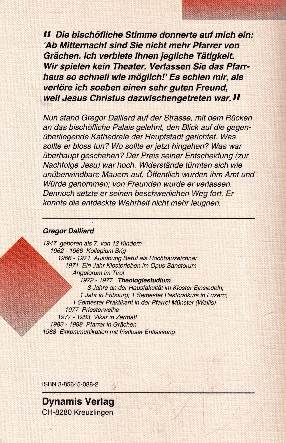 Wir spielen kein Theater. Verlassen Sie das Pfarrhaus so schnell wie möglich! ' Es schien mir, als verlöre ich soeben einen sehr guten Freund, weil Jesus Christus dazwischengetreten war. I Nun stand Gregor Dalliard auf der Strasse, mit dem Rücken an das bischöfliche Palais gelehnt, den Blick auf die gegenüberliegende Kathedrale der Hauptstadt gerichtet. Was sollte er bloss tun? Wo sollte er jetzt hingehen? Was war überhaupt geschehen? Der Preis seiner Entscheidung (zur Nachfolge Jesu) war hoch. Widerstände türmten sich wie unüberwindbare Mauern auf. Öffentlich wurden ihm Amt und Würde genommen; von Freunden wurde er verlassen.
