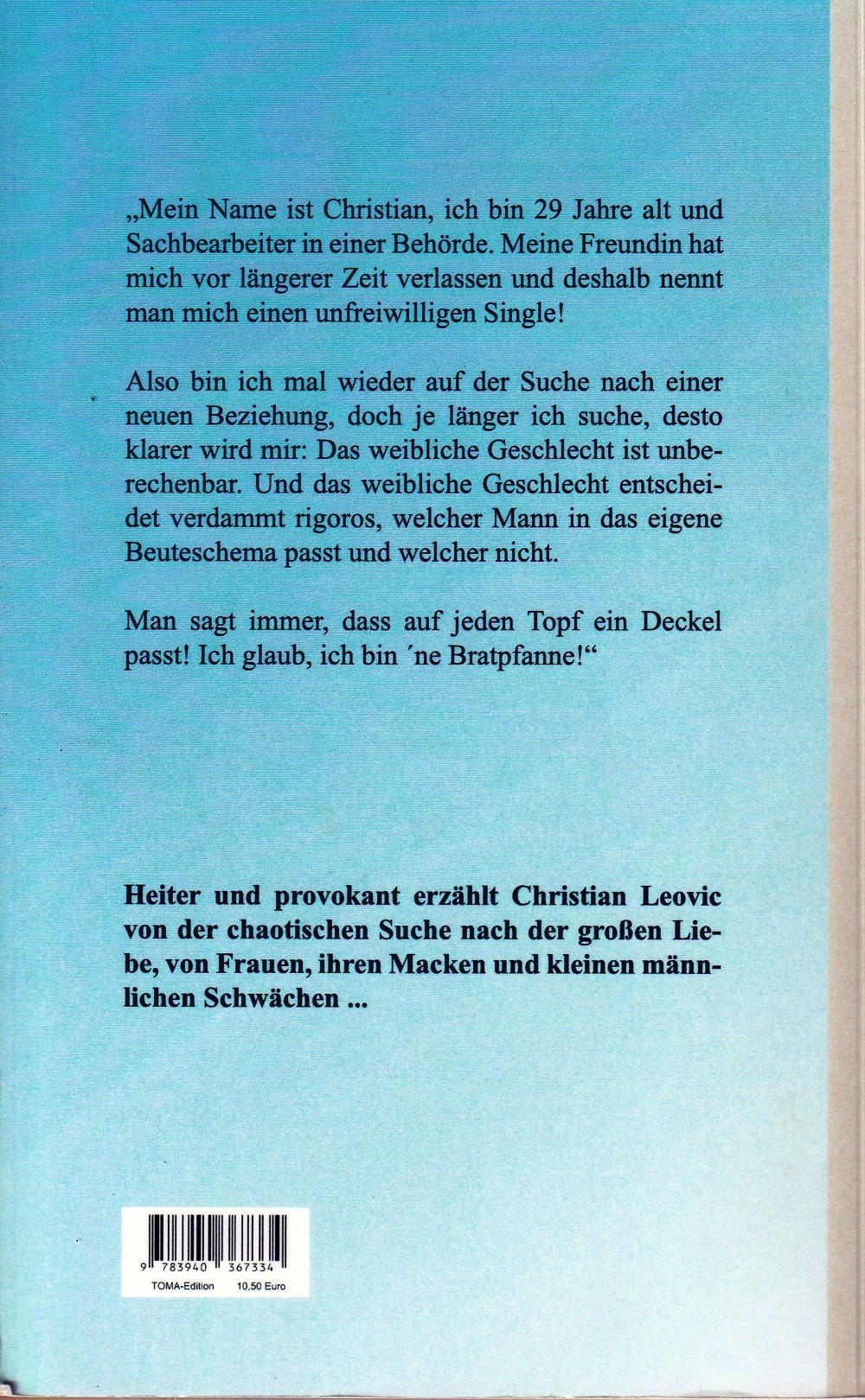 Wer kennt ihn nicht, den Spruch unserer Grosseltern: "Auf jeden Topf passt ein Deckel!" Den Eindruck hat Protagonist Christian jedoch nicht. denn bislang ist seine Suche nach dem passenden weiblichen Gegenstück erfolglos verlaufen. Und eines Tages ist auch er sich sicher: "Ich glaub, ich bin `ne Bratpfanne!" Heiter und witzig erzählt Christian Leovic von der chaotischen Suche nach der grossen Liebe, von Frauen, ihren Macken und kleinen männlichen Schwächen.