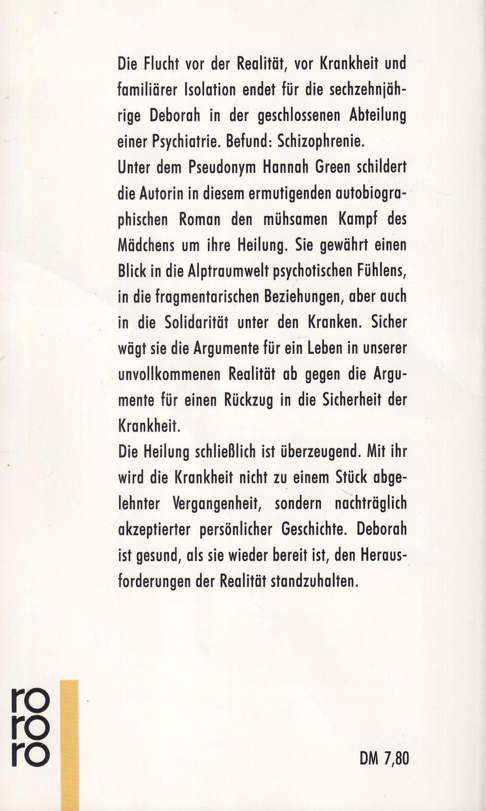 Die Flucht vor der Realität, vor Krankheit und familiärer Isolation endet für die sechzehnjährige Deborah in der geschlossenen Abteilung einer Psychiatrie. Befund: Schizophrenie. Unter dem Pseudonym Hannah Green schildert die Autorin in diesem ermutigenden autobiographischen Roman den mühsamen Kampf des Mädchens um ihre Heilung. Sie gewährt einen Blick in die Alptraumwelt psychotischen Fühlens, in die fragmentarischen Beziehungen, aber auch in die Solidarität unter den Kranken. Sicher wägt sie die Argumente für ein Leben in unserer unvollkommenen Realität ab gegen die Argumente für einen Rückzug in die Sicherheit der Krankheit. Die Heilung schliesslich ist überzeugend. Mit ihr wird die Krankheit nicht zu einem Stück abgelehnter Vergangenheit, sondern nachträglich akzeptierter persönlicher Geschichte. Deborah ist gesund, als sie wieder bereit ist, den Herausforderungen der Realität standzuhalten.