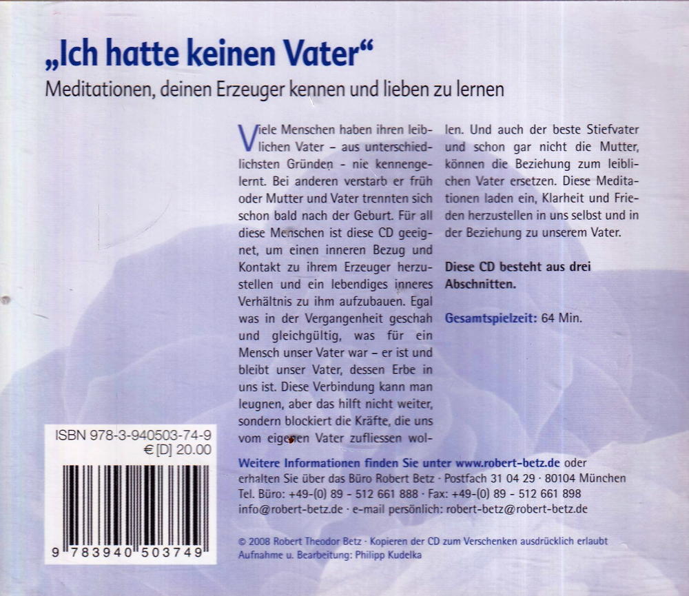 Viele Menschen haben ihren leiblichen Vater – aus unterschiedlichsten Gründen - nie kennengelernt. Bei anderen verstarb er früh oder Mutter und Vater trennten sich schon bald nach der Geburt. Für all diese Menschen ist diese CD geeignet, um einen inneren Bezug und Kontakt zu ihrem Erzeuger herzustellen und ein lebendiges inneres Verhältnis zu ihm aufzubauen. Egal was in der Vergangenheit geschah und gleichgültig, was für ein Mensch unser Vater war – er ist und bleibt unser Vater, dessen Erbe in uns ist. Diese Verbindung kann man leugnen, aber das hilft nicht weiter, sondern blockiert die Kräfte, die uns vom eigenen Vater zufliessen wollen. Und auch der beste Stiefvater und schon gar nicht die Mutter, können die Beziehung zum leiblichen Vater ersetzen. Diese Meditationen laden ein, Klarheit und Frieden herzustellen in uns selbst und in der Beziehung zu unserem Vater.