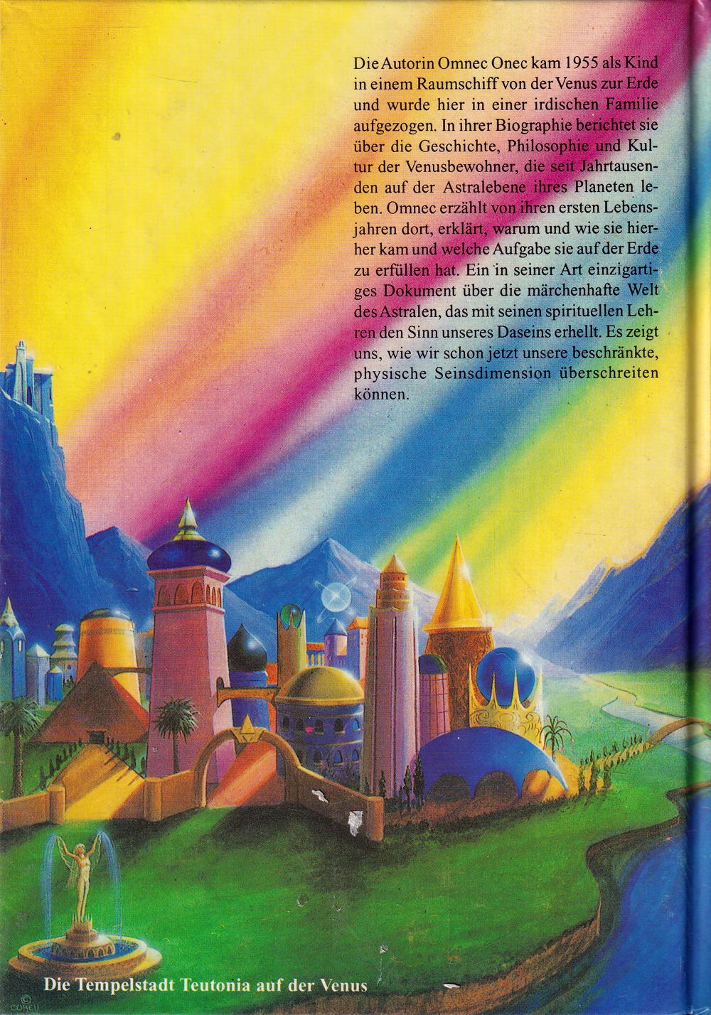 Die Autorin Omnec Onec kam 1955 als Kind in einem Raumschiff von der Venus zur Erde und wurde hier in einer irdischen Familie aufgezogen. In ihrer Autobiographie berichtet sie über die Geschichte, Philosophie und Kultur der Venusbewohner, die seit Jahrtausenden auf der Astralebene ihres Planeten leben. Omnec erzählt von ihren ersten Lebensjahren dort, erklärt, warum und wie sie hierher kam und welche Aufgabe sie auf der erde zu erfüllen hat. Ein Dokument über die märchehafte Welt des Astralen das mit seinen spirituellen Lehren den Sinn unseres Daseins erhellt. Es zeigt uns, wie wir schon jetzt unsere beschränkte, physische Seinsdimension überschreiten können.