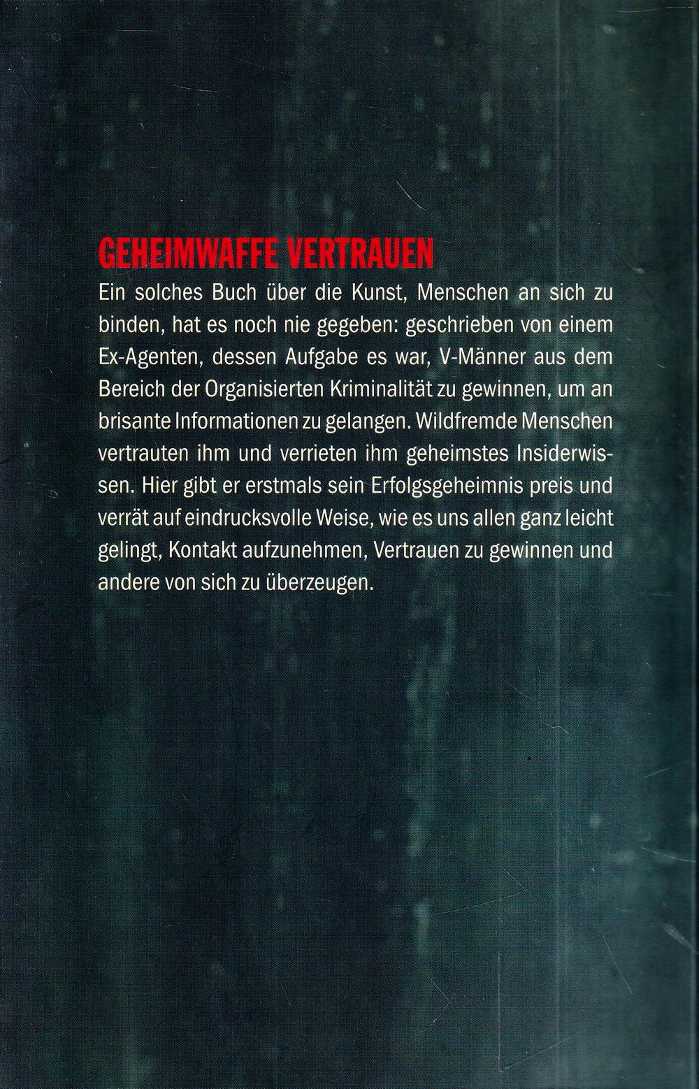 Ein solches Buch über die Kunst, Menschen an sich zu binden, hat es noch nie gegeben: geschrieben von einem Ex-Agenten, dessen Aufgabe es war, V-Männer aus dem Bereich der organisierten Kriminalität zu gewinnen, um an brisante Informationen zu gelangen. Wildfremde Menschen vertrauten ihm und verrieten ihm geheimstes Insiderwissen. Hier gibt er erstmals sein Erfolgsgeheimnis preis und verrät auf eindrucksvolle Weise, wie es uns allen ganz leicht gelingt, Kontakt aufzunehmen, Vertrauen zu gewinnen und andere von sich zu überzeugen.