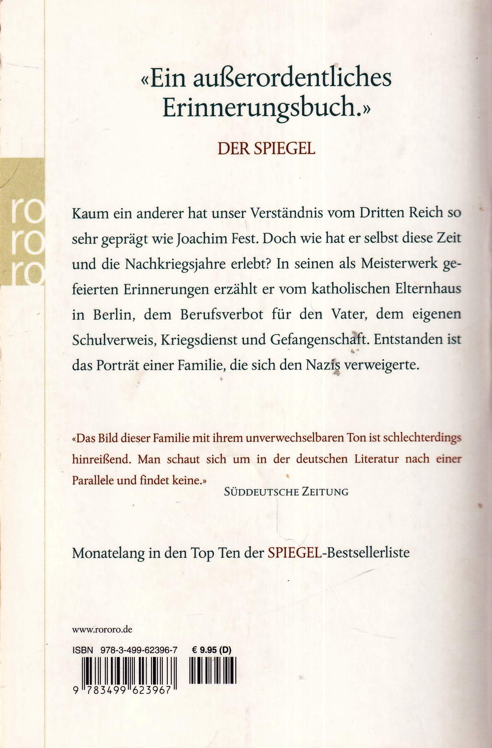Kaum ein anderer hat unser Verständnis vom Dritten Reich so sehr geprägt wie Joachim Fest. Doch wie hat er selbst diese Zeit und die Nachkriegsjahre erlebt? In seinen als Meisterwerk gefeierten Erinnerungen erzählt er vom katholischen Elternhaus in Berlin, dem Berufsverbot für den Vater, dem eigenen Schulverweis, Kriegsdienst und Gefangenschaft. Entstanden ist das Porträt einer Familie, die sich den Nazis verweigerte.