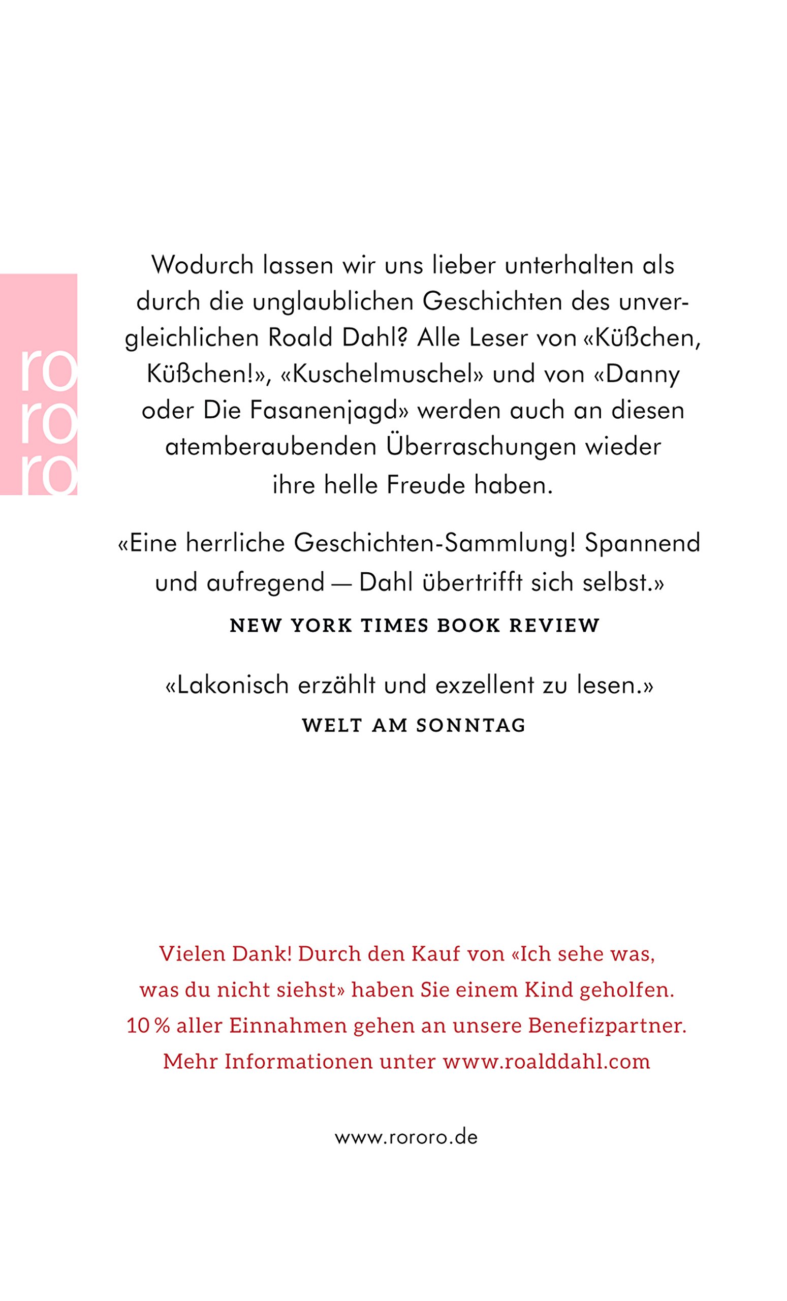 Wodurch lassen wir uns lieber unterhalten als durch die unglaublichen Geschichten des unvergleichlichen Roald Dahl? Alle Leser von "Küsschen, Küsschen", "Kuschelmuschel" und von "Danny oder die Fasanenjagd" werden auch an diesen atemberaubenden Überaschungen wider ihre helle Freude haben.