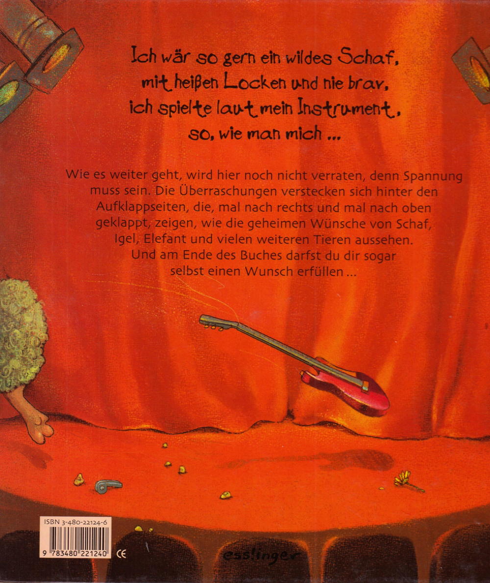 Wie es weiter geht, wird hier noch nicht verraten, denn Spannung muss sein. Die Überraschungen verstecken sich hinter den Aufklappseiten, die, mal nach rechts und mal nach oben geklappt, zeigen, wie die geheimen Wünsche von Schaf, Igel, Elefant und vielen weiteren Tieren aussehen. Und am Ende des Buches darfst du dir sogar selbst einen Wunsch erfüllen...