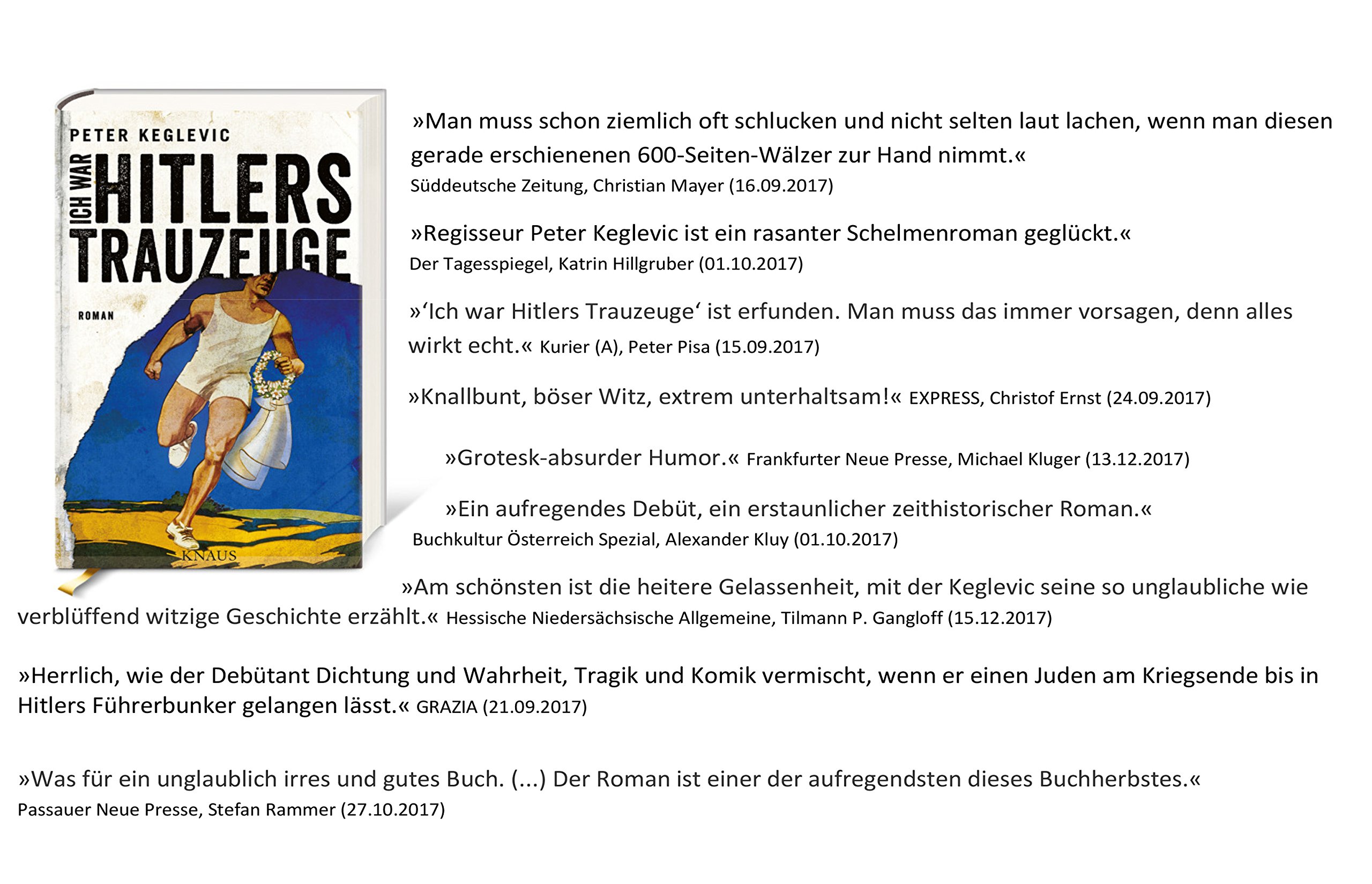 Peter Keglevic, geboren 1950 in Salzburg und gelernter Buchhändler, ist ein erfolgreicher TV-Regisseur, ausgezeichnet u.a. mit dem Grimme-Preis und dem Deutschen Fernsehpreis. Seit über 20 Jahren hat er für »Laufen für den Führer« und die Lebensgeschichte von Harry Freudenthal recherchiert. »Ich war Hitlers Trauzeuge« ist sein erster Roman.