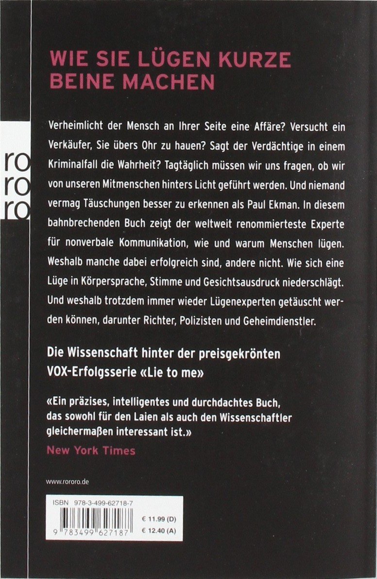 Verheimlicht der Mensch an Ihrer Seite eine Affäre? Versucht ein Verkäufer, Sie übers Ohr zu hauen? Sagt der Verdächtige in einem Kriminalfall die Wahrheit? Tagtäglich müssen wir uns fragen, ob wir von unseren Mitmenschen hinters Licht geführt werden. Und niemand vermag Täuschungen besser zu erkennen als Paul Ekman. In diesem bahnbrechenden Buch zeigt der weltweit renommierteste Experte für nonverbale Kommunikation, wie und warum Menschen lügen. Weshalb manche dabei erfolgreich sind, andere nicht. Wie sich eine Lüge in Körpersprache, Stimme und Gesichtsausdruck niederschlägt. Und weshalb trotzdem immer wieder Lügenexperten getäuscht werden können, darunter Richter, Polizisten und Geheimdienstler.