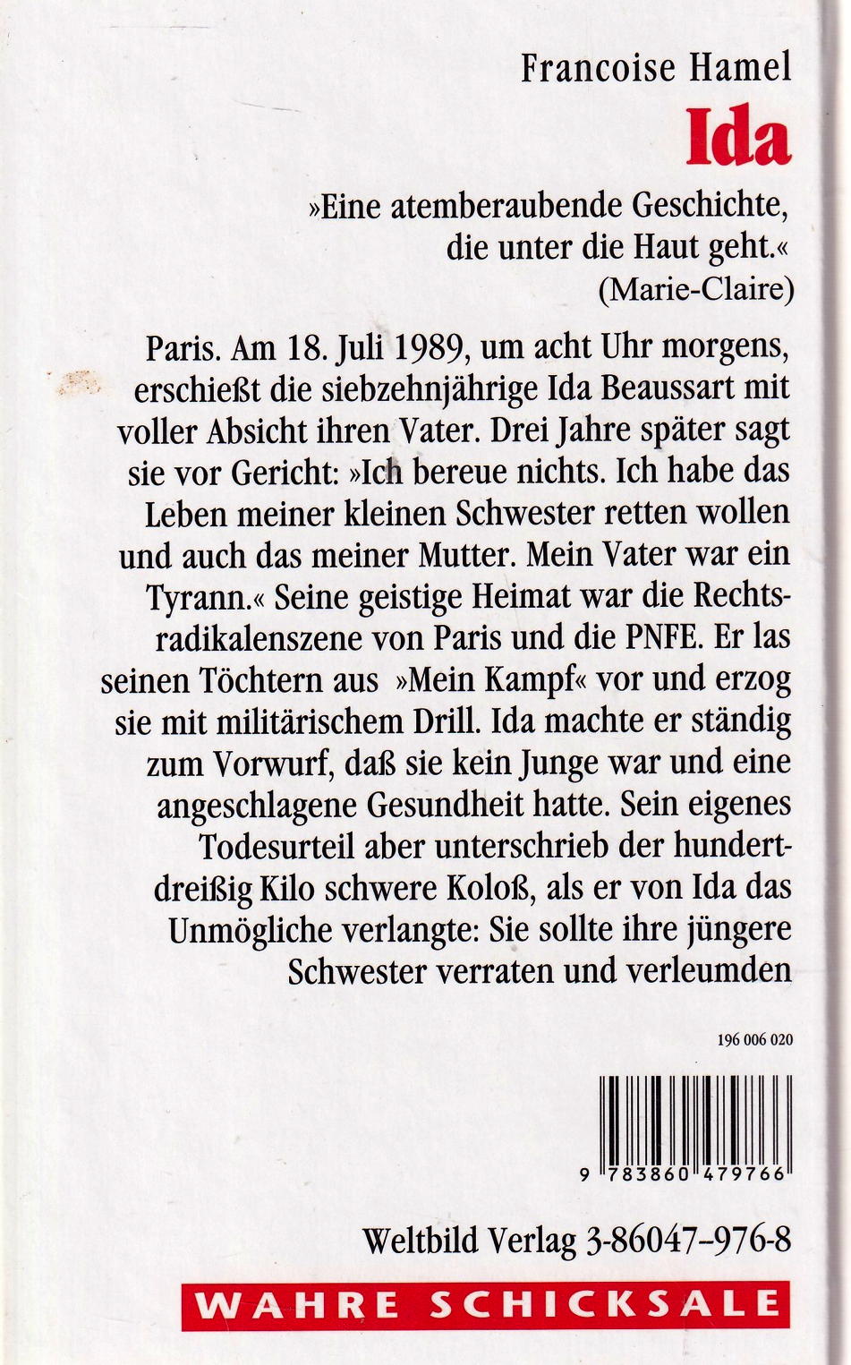 Paris. Am 18. Juli 1989, um acht Uhr morgens, erschiesst die siebzehnjährige Ida Beaussart mit voller Absicht ihren Vater. Drei Jahre später sagt sie vor Gericht: »Ich bereue nichts. Ich habe das Leben meiner kleinen Schwester retten wollen und auch das meiner Mutter. Mein Vater war ein Tyrann. « Seine geistige Heimat war die Rechtsradikalenszene von Paris und die PNFE. Er las seinen Töchtern aus »Mein Kampf« vor und erzog sie mit militärischem Drill. Ida machte er ständig zum Vorwurf, dass sie kein Junge war und eine angeschlagene Gesundheit hatte. Sein eigenes Todesurteil aber unterschrieb der hundertdreissig Kilo schwere Koloss, als er von Ida das Unmögliche verlangte: Sie sollte ihre jüngere Schwester verraten und verleumden.