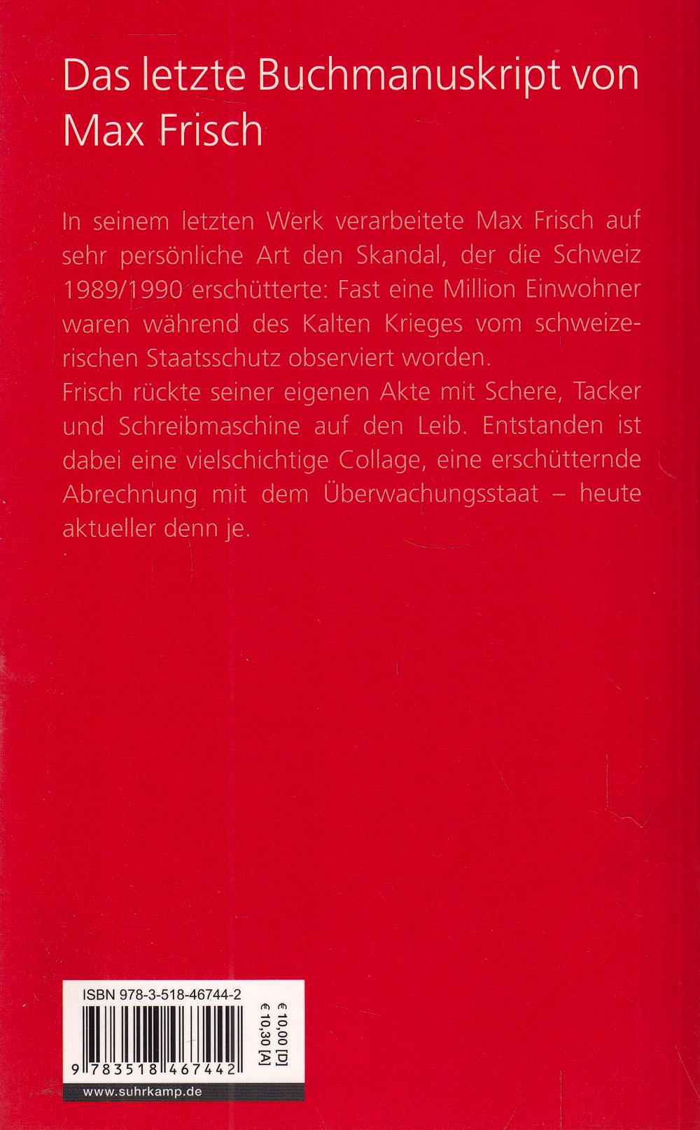 In seinem letzten Typoskript verarbeitete Max Frisch auf sehr persönliche Art jenen Skandal, der die Schweiz 1989/1990 erschütterte: Fast eine Million Einwohner waren während des Kalten Krieges vom schweizerischen Staatsschutz observiert worden.
