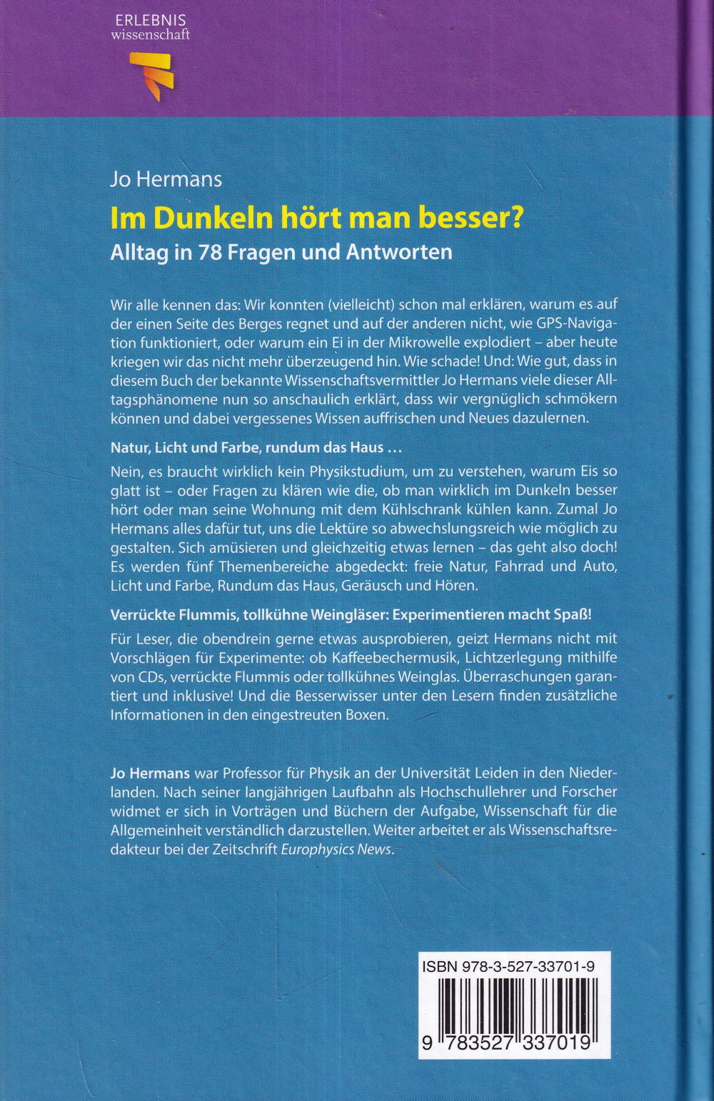 Für Leser, die obendrein auch noch gerne etwas ausprobieren, geizt Hermans nicht mit Vor-schlägen für Experimente: ob Kaffeebechermusik, Lichtzerlegung mithilfe von CDs, verrückte Flummis oder tollkühnes Weinglas. Überraschungen garantiert und inklusive! Und die Besserwisser unter den Lesern finden zusätzliche Informationen in den eingestreuten Boxen. Buchrückseite