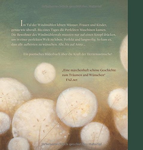 Im Tal der Windmühlen haben die Bewohner das Wünschen verlernt, denn sie besitzen Maschinen, die ihnen auf Knopfdruck perfekte Momente vorgaukeln. Nur Anna, die Schneiderin, hat sich das Träumen bewahrt. Und so glaubt sie ganz fest daran, dass Sie einem Riesen seinen Herzenswunsch erfüllen kann: Er möchte fliegen! Doch wie verhilft man einem Riesen dazu, schwerelos zu schweben wie eine Feder?