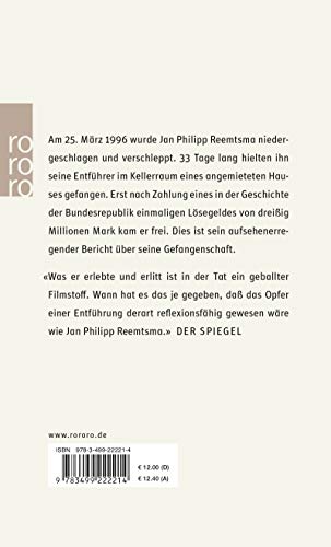 Es ist mittlerweile einige Zeit her, dass Jan Philipp Reemtsma entführt und erpresst wurde. Bis zur Geldübergabe von DM 30 Millionen befand er sich 33 Tage in den Händen seiner Entführer -- gefangen in einem Kellerloch. Nun hat er ein Buch über diese Zeit geschrieben. Als Vorgeschmack sind Auszüge aus diesem Bericht in einer dreiteiligen Spiegel-Serie erschienen und diese Passagen waren beeindruckend. Der jetzt erschienene schmale Band beschreibt auf eine so noch nicht gelesene Art und Weise sein Leben im und nach dem Keller. Zunächst schildert Reemtsma den äusseren Ablauf der Entführung. Wie er brutal vor seinem Haus in Hamburg, Blankenese, niedergeschlagen und in einem Auto verschleppt wurde. Die Rolle seiner Frau, als sie die Polizei hinzuzog und das schwierige Verhandeln mit den Entführern selbst. Es ist die Perspektive von aussen, wie sie später in den Medien nachgelesen werden konnte. Der zweite Teil des Buches berichtet über Reemtsmas Aufenthalt im Keller. Um die notwendige Distanz zu wahren, schreibt er von sich in der dritten Person. Er im Keller hat mit der Person, die er vorher war und nachher ist, nicht das geringste zu tun. Reemstma schildert seinen erzwungenen Aufenthalt, der eine absolute Extremsituation war, mit einer gedanklichen und sprachlichen Präzision, wie man sie in Büchern selten findet. Mit aller Kraft versucht er die immer wieder aufsteigende Panik in Schach zu halten. In seinem Leben als Wissenschaftler hat er sich theoretisch mit Traumen und den Folgen von Folter beschäftigt. Die erlebte Todesangst im Keller, das hilflose Ausgeliefertsein an Entführer, die er nicht einschätzen kann, ist etwas völlig anderes und mit nichts zu vergleichen. Sein Leben wird von anderen Menschen auf sein Geld reduziert: It's just a business -- nichts weiter. Es geht ihm nicht um Mitleid oder Lamentieren. Es geht darum, dass durch diesen Eingriff von aussen der innerste Kern der Persönlichkeit eines Menschen angetastet wurde, und auf irreparable Weise verletzt bleibt. Auch als er viel später der Polizei dabei behilflich ist, den Keller, in dem er gefangengehalten wurde, zu identifizieren, stellt sich das erhoffte Erleichtertsein nicht ein. Der Keller ist aus seinem Leben nicht mehr wegzudenken -- nicht einmal mit der grösstmöglichen Anstrengung. Reemtsma zieht ein niederschmetterndes Resümee: Das Gefühl, um das ich mich hier bemüht habe, ist kaum anders auf den Punkt zu bringen: Alles ist, wie es war, nur passt es mit mir nicht mehr zusammen. Als trüge ich eine Brille, die alles einen halben Zentimeter nach links oder rechts verschiebt. Am Ende seiner Aufzeichnungen steht die verzweifelte Erkenntnis, dass alles was wichtig ist, in der Welt ist, und ich bin eben nicht darin.