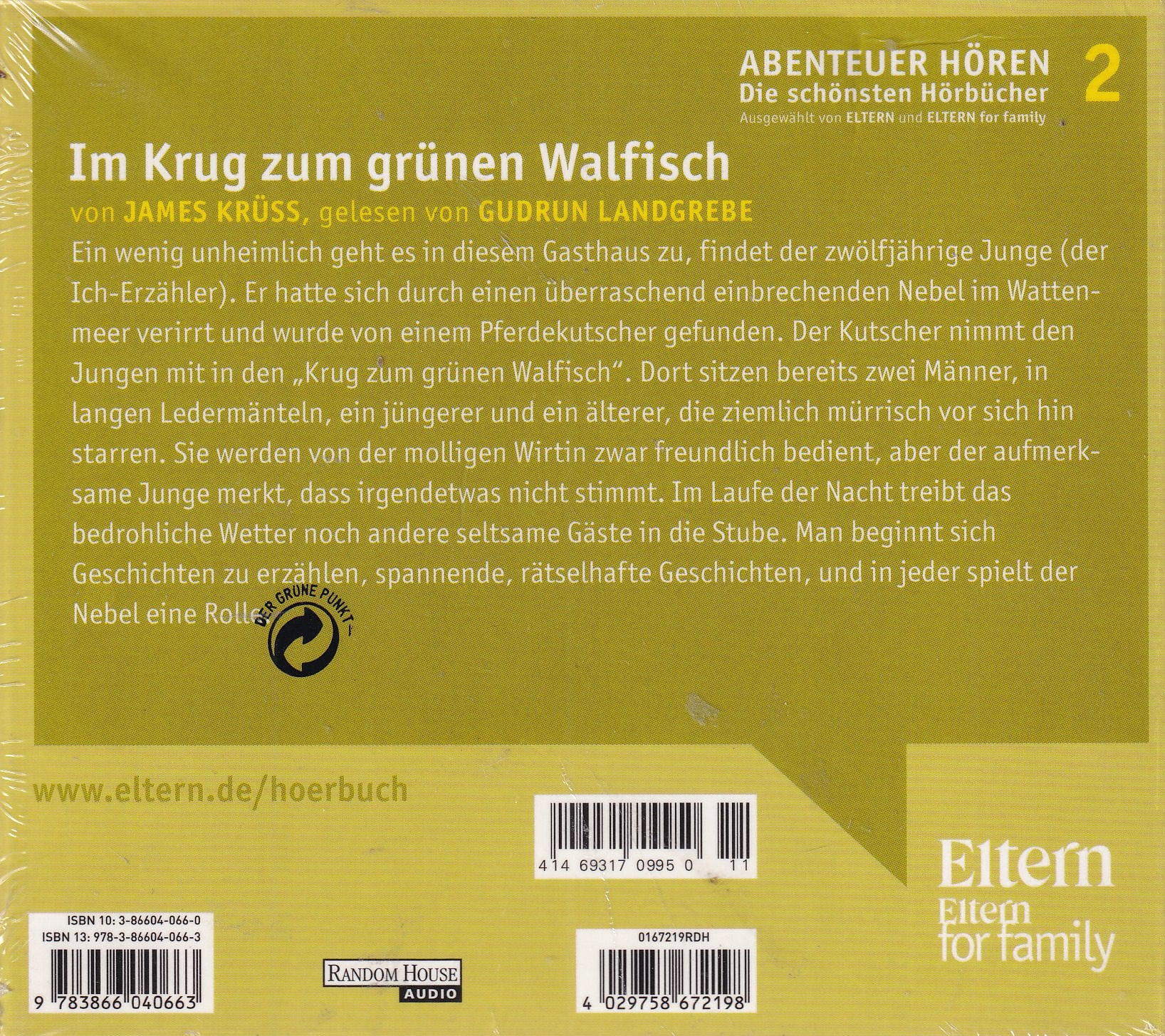 Ein wenig unheimlich geht es in diesèm Gasthaus zu, findet der zwölfjährige Junge (der Ich-Erzähler). Er hatte sich durch einen überraschend einbrechenden Nebel im Wattenmeer verirrt und wurde von einem Pferdekutscher gefunden. Der Kutscher nimmt den Jungen mit in den „Krug zum grünen Walfisch". Dort sitzen bereits zwei Männer, in langen Ledermänteln, ein jüngerer und ein älterer, die ziemlich mürrisch vor sich hin starren. Sie werden von der molligen Wirtin zwar freundlich bedient, aber der aufmerksame Junge merkt, dass irgendetwas nicht stimmt. Im Laufe der Nacht treibt das bedrohliche Wetter noch andere seltsame Gäste in die Stube. Man beginnt sich Geschichten zu erzählen, spannende, rätselhafte Geschichten, und in jeder spielt der Nebel eine Rolle