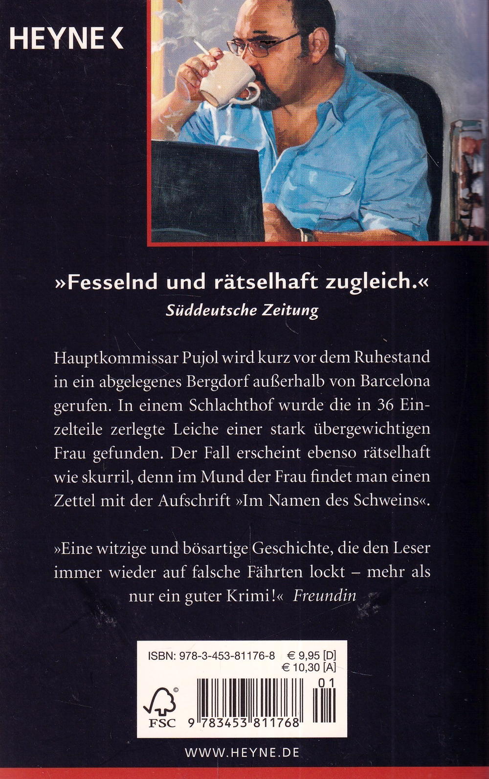 Hauptkommissar Pujol wird kurz vor dem Ruhestand in ein abgelegenes Bergdorf ausserhalb von Barcelona gerufen. In einem Schlachthof wurde die in 36 Einzelteile zerlegte Leiche einer stark übergewichtigen Frau gefunden. Der Fall erscheint ebenso rätselhaft wie skurril, denn im Mund der Frau findet man einen Zettel mit der Aufschrift "Im Namen des Schweins".