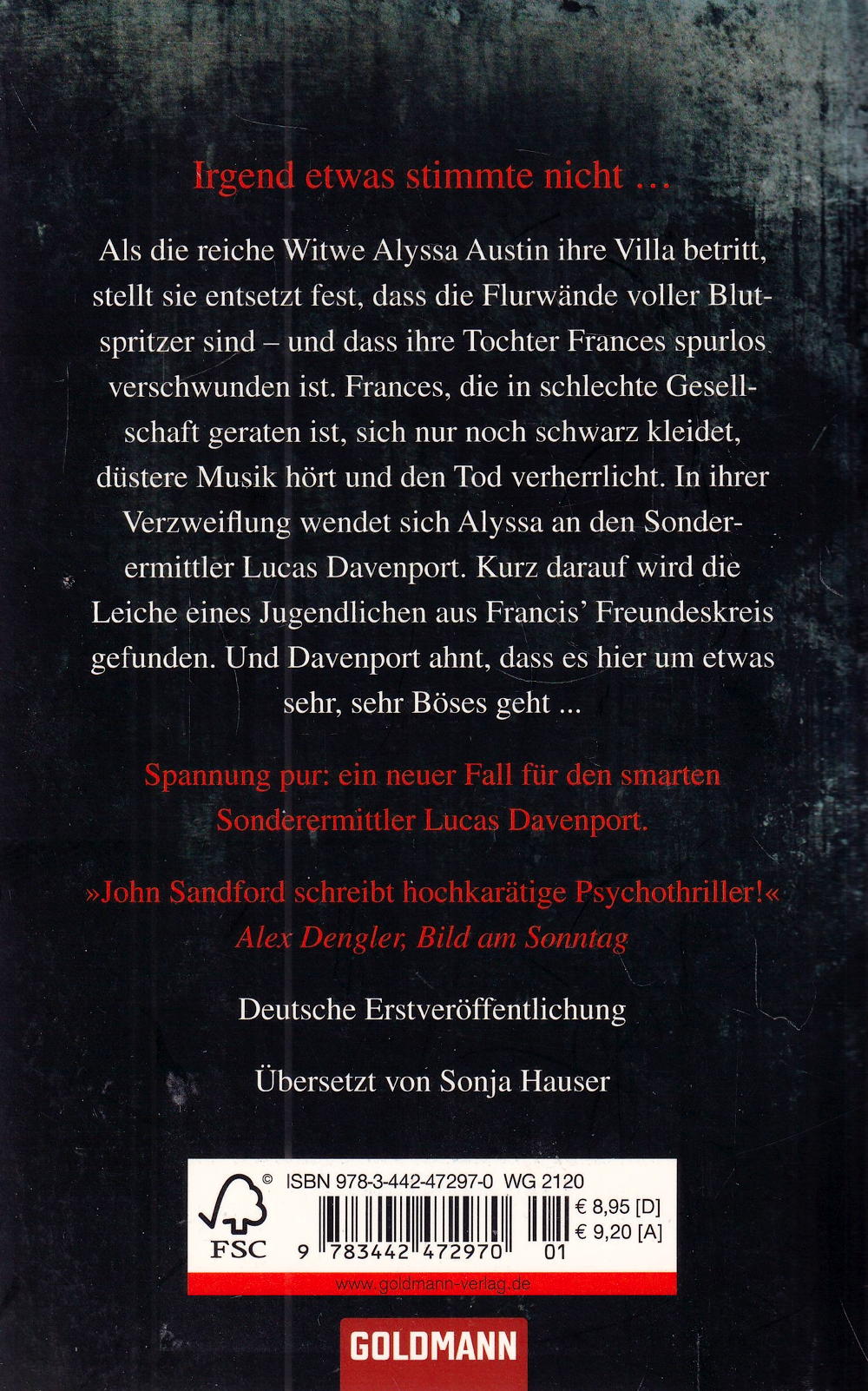 Als die reiche Witwe Alyssa Austin eines Abends ihre Villa betritt, stellt sie entsetzt fest, dass die Flurwände voller Blutspritzer sind. Sofort denkt Alyssa an ihre Tochter Frances, die in schlechte Gesellschaft geraten ist. Doch von Frances fehlt jede Spur. In ihrer Verzweiflung wendet sich Alyssa an den Sonderermittler Lucas Davenport, den Mann einer Bekannten. Kurz darauf wird die Leiche eines Jungen aus Francis' Freundeskreis gefunden. Davenport tut sich mit den Ermittlungen schwer. Aber er ahnt, dass es hier um etwas sehr Böses geht ...