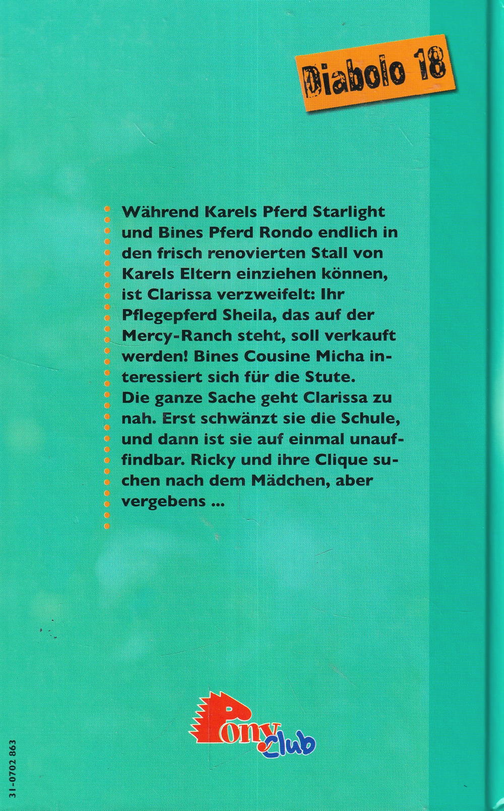 Während Karels Pferd Starlight und Bines Pferd Rondo endlich in den frisch renovierten Stall von Karels Eltern einziehen können, ist Clarissa verzweifelt: Ihr Pflegepferd Sheila, das auf der Mercy-Ranch steht, soll verkauft werden! Bines Cousine Micha interessiert sich für die Stute. Die ganze Sache geht Clarissa zu nah. Erst schwänzt sie die Schule, und dann ist sie auf einmal unauffindbar. Ricky und ihre Clique suchen nach dem Mädchen, aber vergebens...