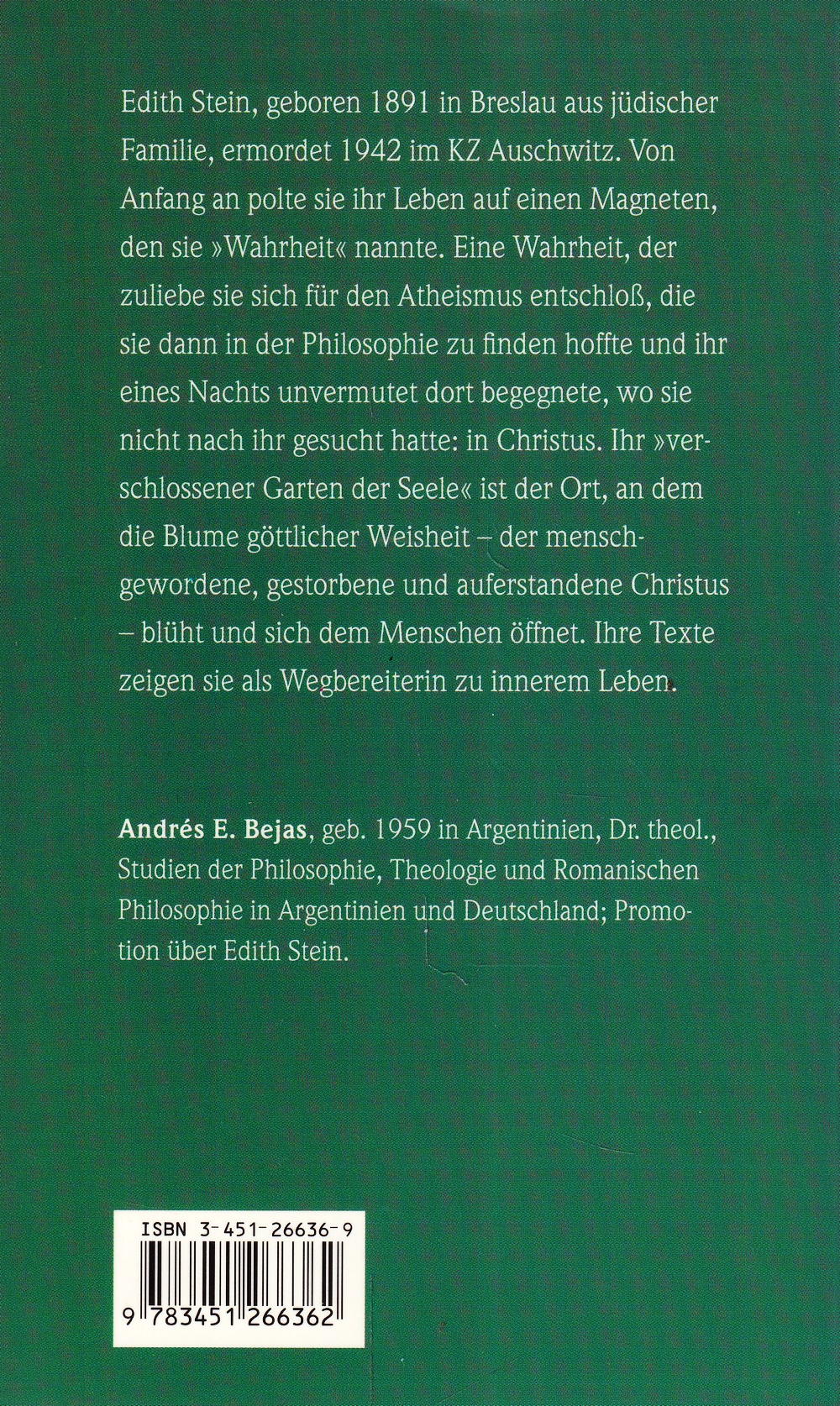 Edith Stein, geboren 1891 in Breslau aus jüdischer Familie, ermordet 1942 im KZ Auschwitz. Von Anfang an polte sie ihr Leben auf einen Magneten, den sie »Wahrheit« nannte. Eine Wahrheit, der zuliebe sie sich für den Atheismus entschloss, die sie dann in der Philosophie zu finden hoffte und ihr eines Nachts unvermutet dort begegnete, wo sie nicht nach ihr gesucht hatte: in Christus. Ihr »verschlossener Garten der Seele« ist der Ort, an dem die Blume göttlicher Weisheit - der menschgewordene, gestorbene und auferstandene Christus - blüht und sich dem Menschen öffnet. Ihre Texte zeigen sie als Wegbereiterin zu innerem Leben.