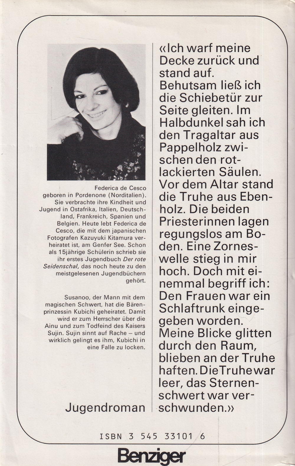 «Ich warf meine Decke zurück und stand auf. Behutsam liess ich die Schiebetür zur Seite gleiten. Im Halbdunkel sah ich den Tragaltar aus Pappelholz zwischen den rotlackierten Säulen. Vor dem Altar stand die Truhe aus Ebenholz. Die beiden Priesterinnen lagen regungslos am Boden. Eine Zorneswelle stieg in mir hoch. Doch mit einemmal begriff ich: Den Frauen war ein Schlaftrunk eingegeben worden. Meine Blicke glitten durch den Raum, blieben an der Truhe haften. DieTruhewar leer, das Sternenschwert war verschwunden. »