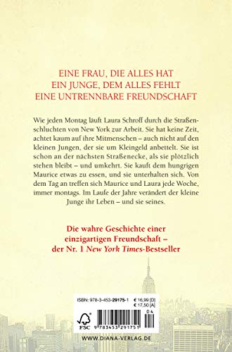 Eine Frau, die alles hat. Ein Junge, dem alles fehlt. Eine untrennbare Freundschaft. Laura ist eine erfolgreiche Verkaufsleiterin, die an einem normalen Montag durch die Strassen von New York hetzt. Sie hat keine Zeit, achtet kaum auf ihre Mitmenschen – auch nicht auf den kleinen Jungen, der sie um Kleingeld anbettelt. Sie ist schon an der nächsten Strassenecke, als sie plötzlich stehen bleibt – und umkehrt. Sie kauft dem hungrigen Maurice etwas zu essen und erfährt von seinem Leben. Von dem Tag an treffen sich Maurice und Laura jede Woche über Jahre hinweg, immer montags. Dies ist die Geschichte ihrer einzigartigen Freundschaft – die bis heute anhält.