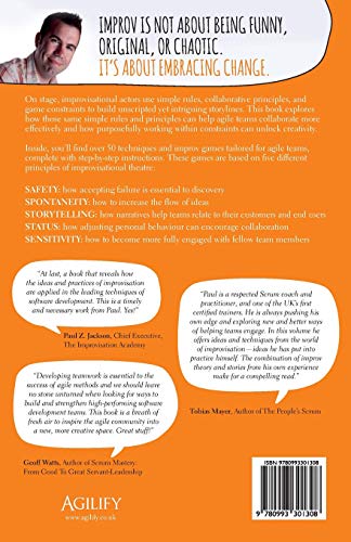 IMPROV IS NOT ABOUT BEING FUNNY, ORIGINAL, OR CHAOTIC. IT'S ABOUT EMBRACING CHANGE. Improvisation. The mere mention of the word makes many people quake with fear at the prospect of chaos and uncertainty. The fact is, though, human beings are improvising almost every minute of their lives it is more natural, and more filled with possibility, than you might imagine. On stage, improvisational actors use simple rules, collaborative principles, and game constraints to build unscripted yet intriguing storylines. This book explores how those same simple rules and principles can help agile teams collaborate more effectively and how purposefully working within constraints can unlock creativity. Inside, you ll find over 50 techniques and improv games tailored for agile teams, complete with step-by-step instructions. These games are based on five different principles of improvisational theatre: