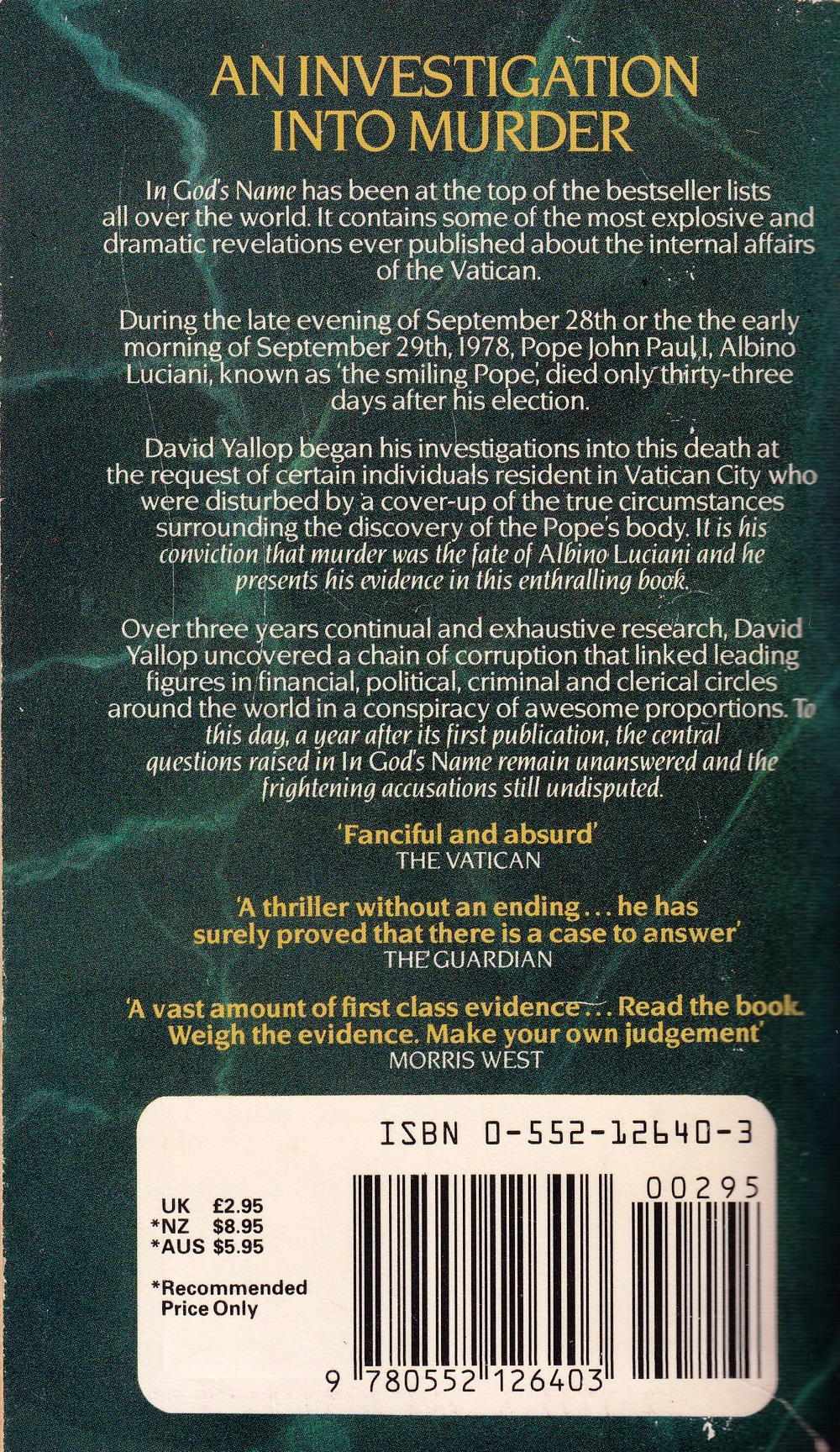 David Yallop began his investigations into this death at the request of certain individuals resident in Vatican City who were disturbed by a cover-up of the true circumstances surrounding the discovery of the Pope's body. It is his conviction that murder was the fate of Albino Luciani and he presents his evidence in this enthralling book, Over three years continual and exhaustive research, David Yallop uncovered a chain of corruption that linked leading figures in financial, political, criminal and clerical circles around the world in a conspiracy of awesome proportions. To this day, a year after its first publication, the central questions raised in In God's Name remain unanswered and the frightening accusations still undisputed.
