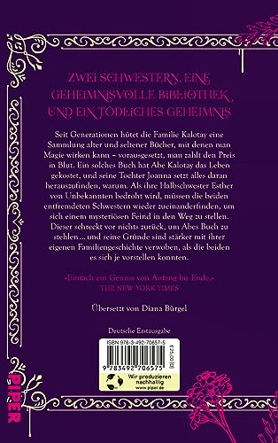 Bücher, in Blut geschrieben. Spiegel, durch die mysteriöse Verfolger jeden Schritt beobachten. Und eine magische Bibliothek voller Geheimnisse. Seit Generationen hütet die Familie Kalotay eine Sammlung alter und seltener Bücher. Bücher, mit denen man Magie wirken kann – vorausgesetzt, man zahlt den Preis in Blut. Ein solches Buch hat Abe Kalotay das Leben gekostet, und seine Tochter Joanna setzt alles daran, herauszufinden, warum. Als ihre Halbschwester Esther von Unbekannten bedroht wird, müssen die beiden entfremdeten Schwestern wieder zueinander finden, um sich einem mysteriösen Feind in den Weg zu stellen. Doch dieser schreckt vor nichts zurück, um Abes Buch zu stehlen – nicht einmal vor Mord. »Einfach ein Genuss von Anfang bis Ende. « The New York Times