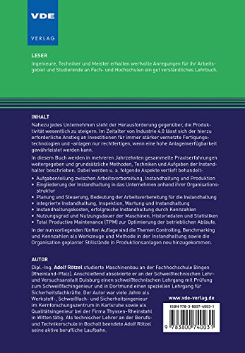 weitergegeben und grundsätzliche Methoden, Techniken und Aufgaben der Instandhalter beschrieben. Dabei werden u. a. folgende Aspekte vertieft behandelt: Aufgabenteilung zwischen Arbeitsvorbereitung, Instandhaltung und Produktion; Eingliederung der Instandhaltung in das Unternehmen anhand ihrer Organisationsstruktur; Planung und Steuerung, Bedeutung der Arbeitsvorbereitung für die Instandhaltung; integrierte Instandhaltung, Inspektion, Wartung und Instandhaltung; Instandhaltungskosten, erfolgreiche Instandhaltung durch Kennzahlen; Nutzungsgrad und Nutzungsdauer der Maschinen, Historiedaten und Statistiken; Total Productive Maintenance (TPM) zur Optimierung der betrieblichen Abläufe. In der nun vorliegenden fünften Auflage sind die Themen Controlling, Benchmarking und Kennzahlen als Werkzeuge und Methode in der Instandhaltung sowie die Organisation geplanter Stillstände in Produktionsanlagen neu hinzugekommen.