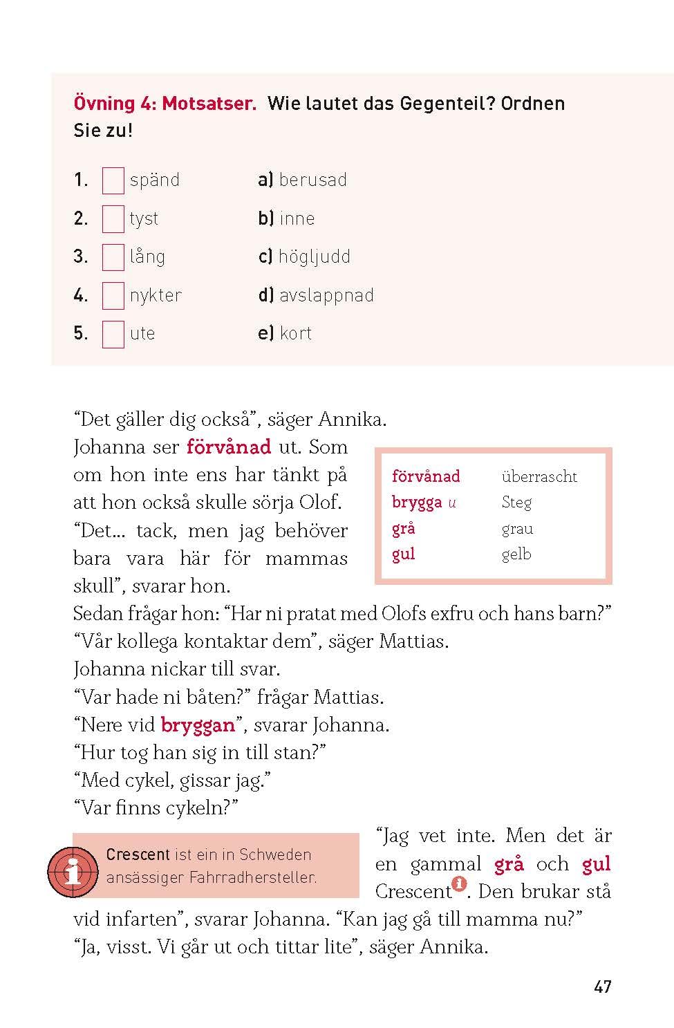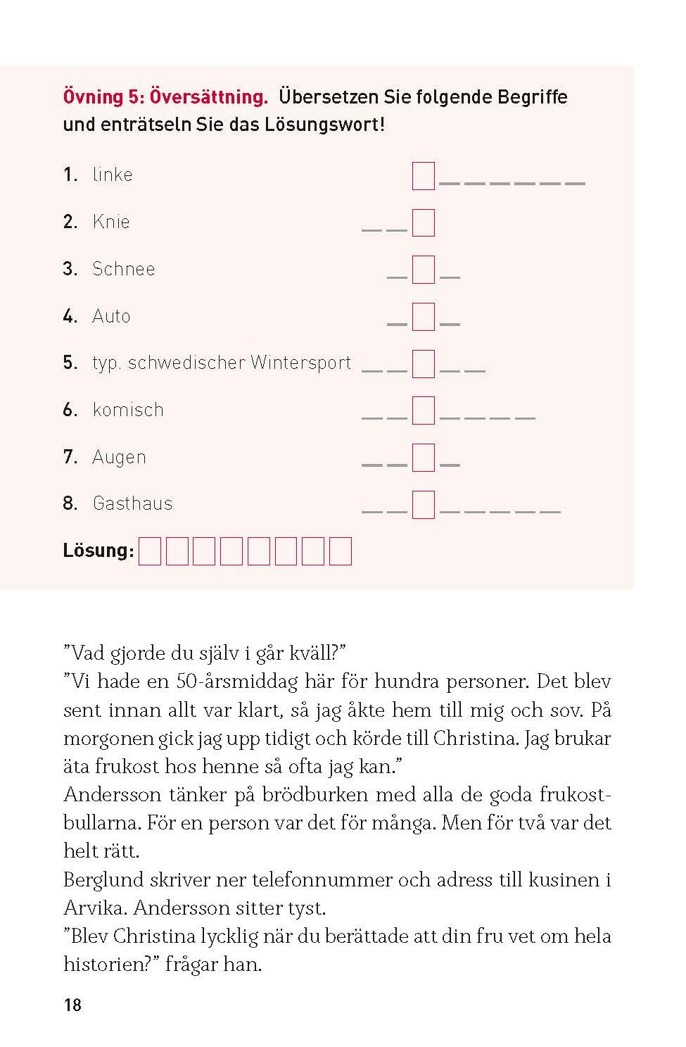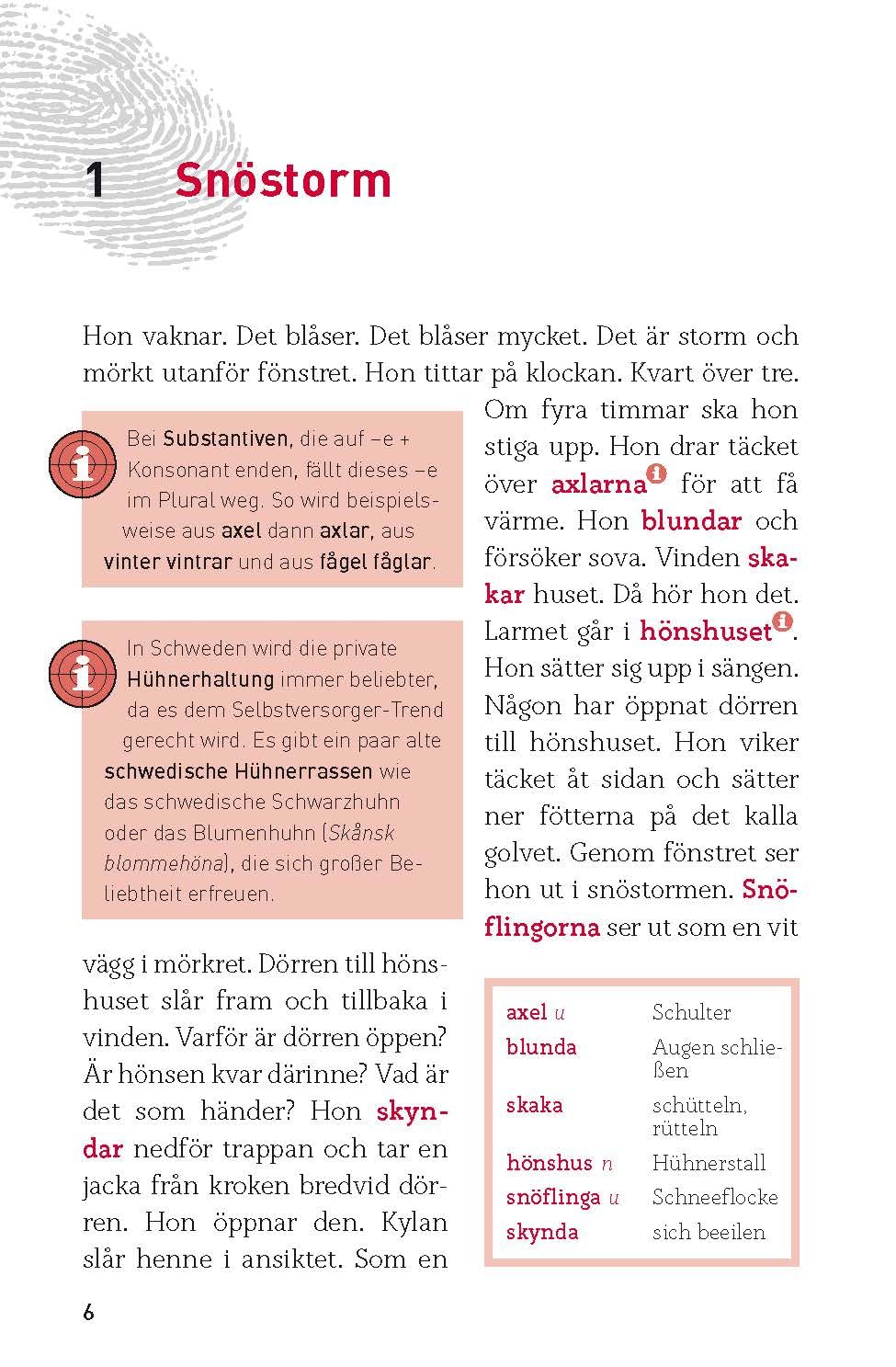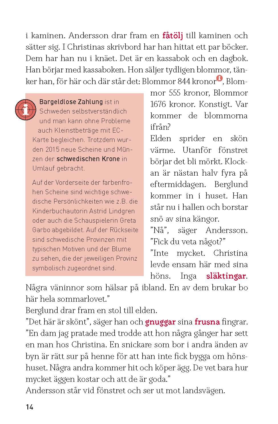 Sie lernen gerade Schwedisch und möchten Ihre Sprachkenntnisse verbessern oder vorhandenes Wissen auffrischen? Sie wollen die schwedische Sprache erlernen und dabei unterhalten werden? Sie lieben spannende Geschichten und wollen authentische Texte auf Schwedisch lesen? Dann sind unsere Lernkrimi Kurzkrimis genau das Richtige für Sie. In Iskallt mord erwarten Sie drei spannende Kriminalfälle, die von muttersprachlichen Autor*innen speziell für das Niveau A1 geschrieben wurden. Mit dem einzigartigen Lernkonzept erwerben Sie spielerisch Sprachkompetenzen. Gehen Sie mit unseren Ermittler*innen auf Verbrecherjagd und verbessern Sie ganz nebenbei Ihren Schwedisch-Wortschatz, vertiefen Sie Ihre Grammatikkenntnisse und erfahren Sie Wissenswertes über Land und Leute. Speziell konzipierte, thematische Übungen erhöhen den Lerneffekt. So geht Sprachenlernen!