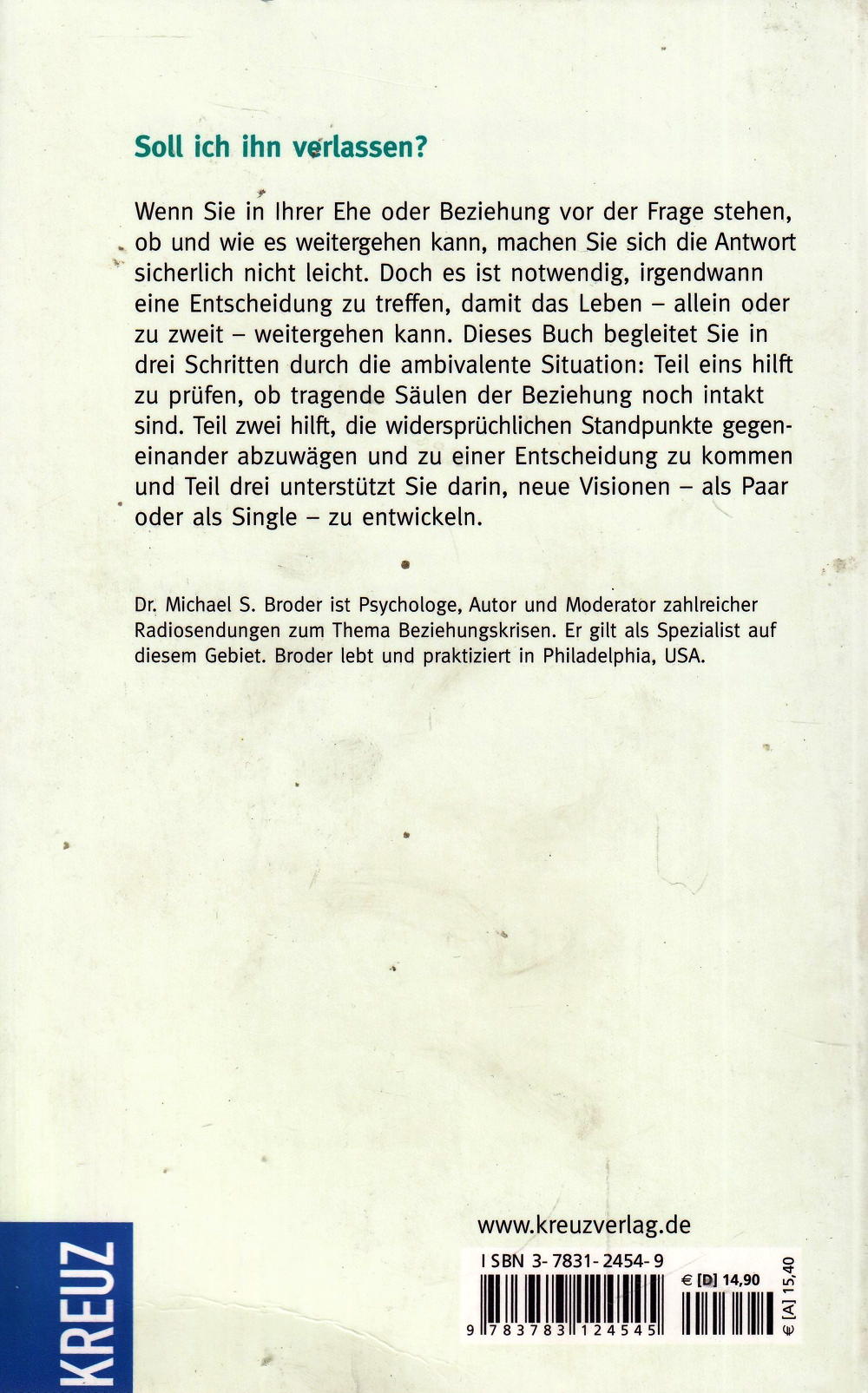 Wenn Sie in Ihrer Ehe oder Beziehung vor der Frage stehen, ob und wie es weitergehen kann, machen Sie sich die Antwort sicherlich nicht leicht. Doch es ist notwendig, irgendwann eine Entscheidung zu treffen, damit das Leben – allein oder zu zweit – weitergehen kann. Dieses Buch begleitet Sie in drei Schritten durch die ambivalente Situation: Teil eins hilft zu prüfen, ob tragende Säulen der Beziehung noch intakt sind. Teil zwei hilft, die widersprüchlichen Standpunkte gegeneinander abzuwägen und zu einer Entscheidung zu kommen und Teil drei unterstützt Sie darin, neue Visionen - als Paar oder als Single zu entwickeln.