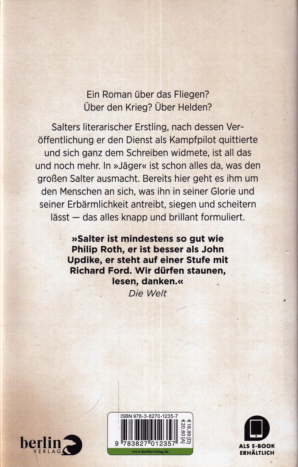 »Die Jäger, 1957 erschienen, ist der erste Roman von Salter und zugleich einer der prägnantesten Nachweise seines Talents. Der Roman ist autobiographisch und stützt sich auf Salters Erfahrungen als Kampfflieger im Koreakrieg. Während auf dem Boden ein schwerer Bürgerkrieg herrscht, wetteifern die Piloten in der Luft in ihren Kampfeinsätzen um die begehrten fünf Kills - den gültigen Nachweis dafür, dass man ein >As< ist. Die Zerrissenheit zwischen der unbedingten Pflicht, für die Sicherheit der Kameraden zu sorgen (die heilige Pflicht des wingman), und der Waghalsigkeit, die nötig ist, um den Feind zu eliminieren, droht Salters Hauptfigur, Cleve Connell, zu zerstören.« Besser als der britische Autor Geoff Dyer kann man diesen Roman kaum beschreiben. Salter war sein literarisches Debüt so wichtig, dass er es 1997 leicht überarbeitete und neu herausbrachte. Mit Erfolg, denn Mark Greif urteilte daraufhin im Times Literary Supplement »Andere Bücher aus jener Zeit sind vergessen - dies hier entpuppt sich als Klassiker.«