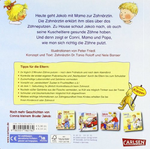 Heute geht Jakob mit Mama zur Zahnärztin. Die Zahnärztin erklärt ihm alles über das Zähneputzen. Zu Hause schaut Jakob nach, ob auch seine Kuscheltiere gesunde Zähne haben. Und dann zeigt er Conni, Mama und Papa wie man sich richtig die Zähne putzt.