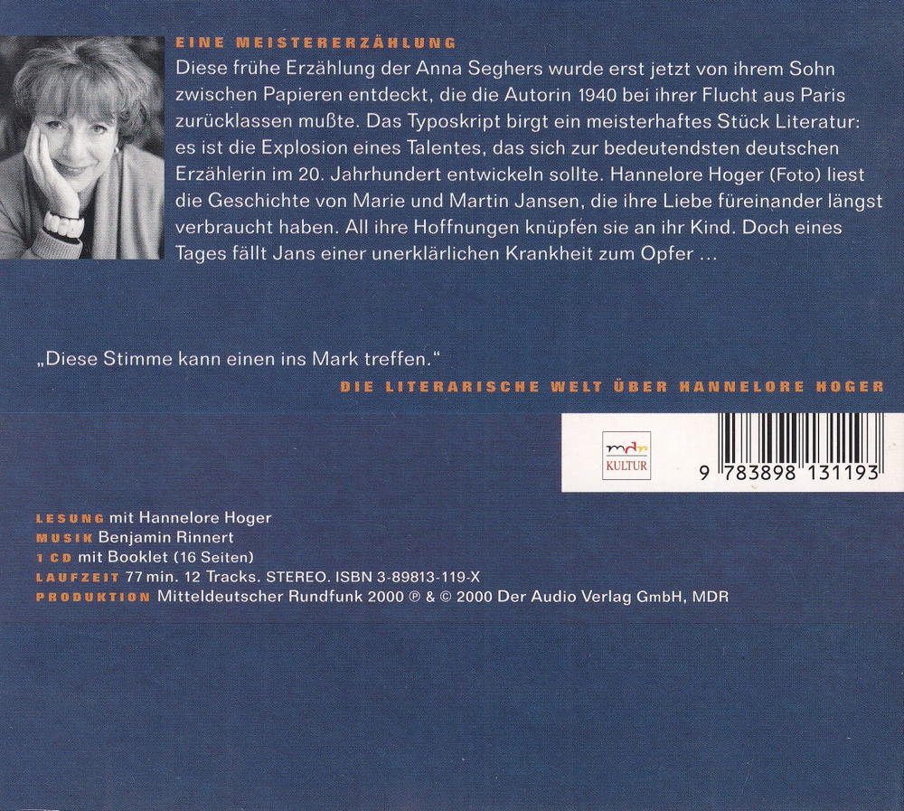 es ist die Explosion eines Talentes, das sich zur bedeutendsten deutschen Erzählerin im 20. Jahrhundert entwickeln sollte. Hannelore Hoger (Foto) liest die Geschichte von Marie und Martin Jansen, die ihre Liebe füreinander längst verbraucht haben. All ihre Hoffnungen knüpfen sie an ihr Kind. Doch eines Tages fällt Jans einer unerklärlichen Krankheit zum Opfer...