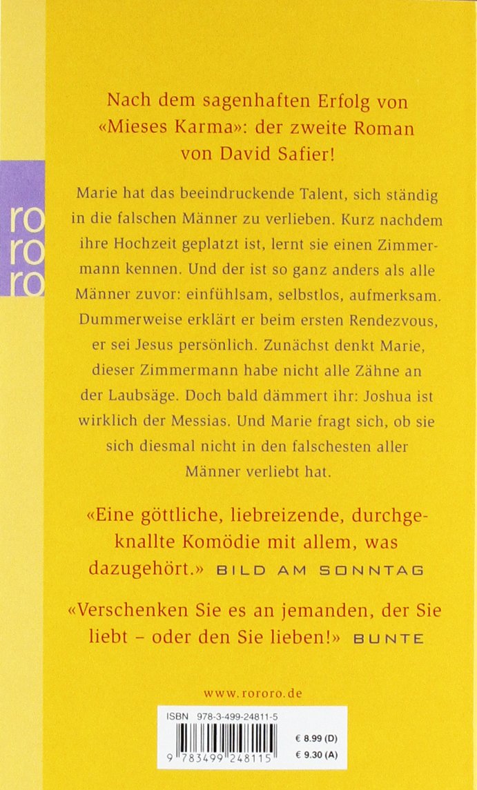 Marie hat das beeindruckende Talent, sich ständig in die falschen Männer zu verlieben. Kurz nachdem ihre Hochzeit geplatzt ist, lernt sie einen Zimmermann kennen. Und der ist so ganz anders als alle Männer zuvor: einfühlsam, selbstlos, aufmerksam. Dummerweise erklärt er beim ersten Rendezvous, er sei Jesus persönlich. Zunächst denkt Marie, dieser Zimmermann habe nicht alle Zähne an der Laubsäge. Doch bald dämmert ihr: Joshua ist wirklich der Messias. Und Marie fragt sich, ob sie sich diesmal nicht in den falschesten aller Männer verliebt hat.