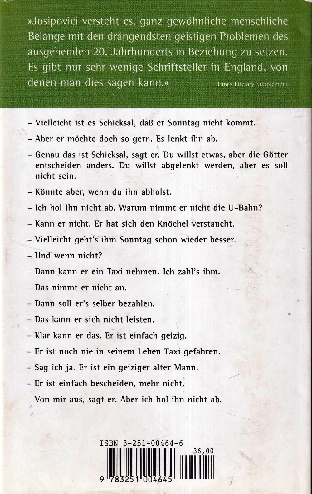 Gabriel Josipovici, geboren 1940 in Nizza, aufgewachsen in Ägypten, unterrichtete Englisch an der St. Edmund Hall in Oxford und ist heute Anglistik-Professor der School of European Studies an der University of Sussex. Er veröffentlichte mehrere Romane, Theaterstücke und Sachbücher. Grosse Beachtung fand seine umfangreiche Untersuchung The Book of God: A Response to the Bible (1990). Er lebt in Sussex. Jetzt ist sein jüngster Roman.