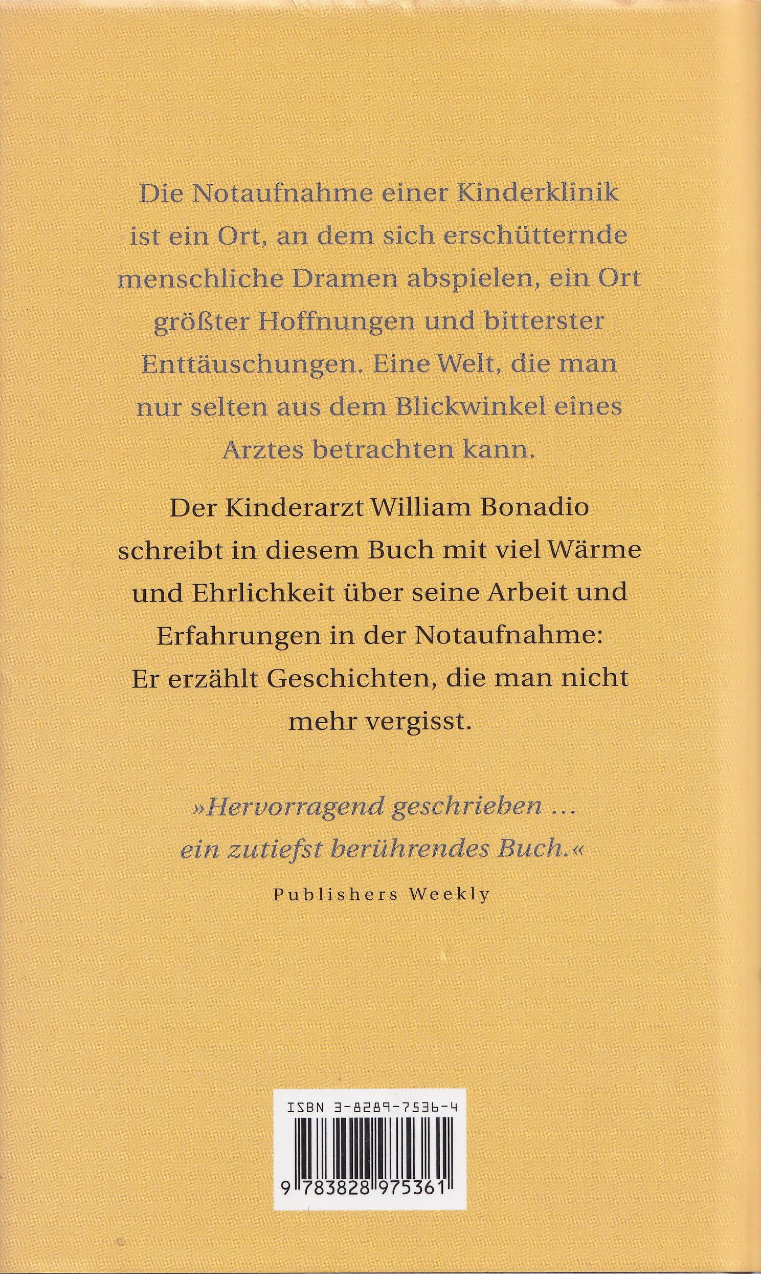 Der Kinderarzt William Bonadio schreibt in diesem Buch mit viel Wärme und Ehrlichkeit über seine Arbeit und Erfahrungen in der Notaufnahme: Er erzählt Geschichten, die man nicht mehr vergisst.