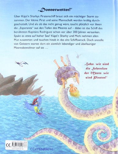 „Donnerwetter!“ Über Käpt’n Sharkys Piratenschiff braut sich ein mächtiger Sturm zusammen. Der kleine Pirat und seine Mannschaft werden kräftig durchgeschüttelt. Und als ob das nicht genug wäre, taucht plötzlich vor ihnen die „Esperanza“ aus den tosenden Fluten auf – dabei ist das Schiff des berühmten Kapitäns Rodriguez schon vor über 300 Jahren gesunken. Spukt es etwa auf hoher See? Käpt’n Sharky und Michi nehmen allen Mut zusammen und tauchen hinab in das alte Schiffswrack. Doch anstelle von Geistern wartet dort ein ziemlich lebendiger und übellauniger Meeresbewohner auf sie.