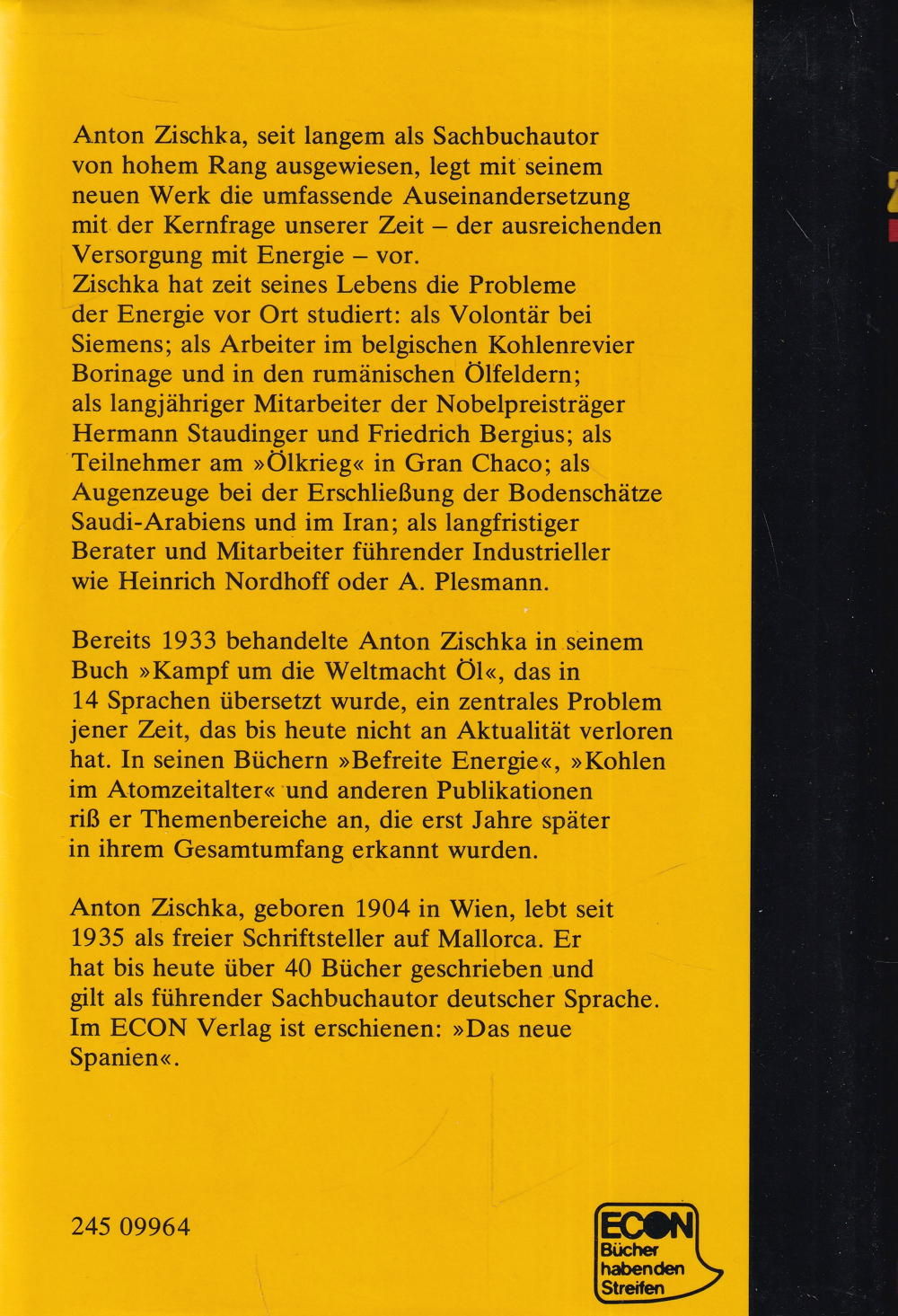 Anton Zischka, geboren 1904 in Wien, lebt seit 1935 als freier Schriftsteller auf Mallorca. Er hat bis heute über 40 Bücher geschrieben und gilt als führender Sachbuchautor deutscher Sprache.