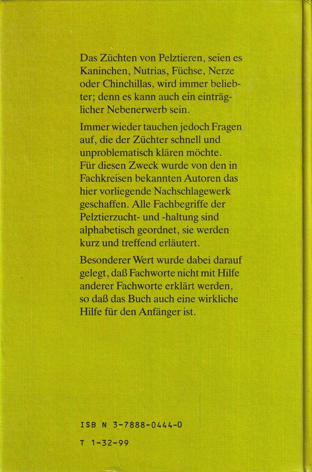 Für diesen Zweck wurde von den in Fachkreisen bekannten Autoren das hier vorliegende Nachschlagewerk geschaffen. Alle Fachbegriffe der Pelztierzucht- und -haltung sind alphabetisch geordnet, sie werden kurz und treffend erläutert.