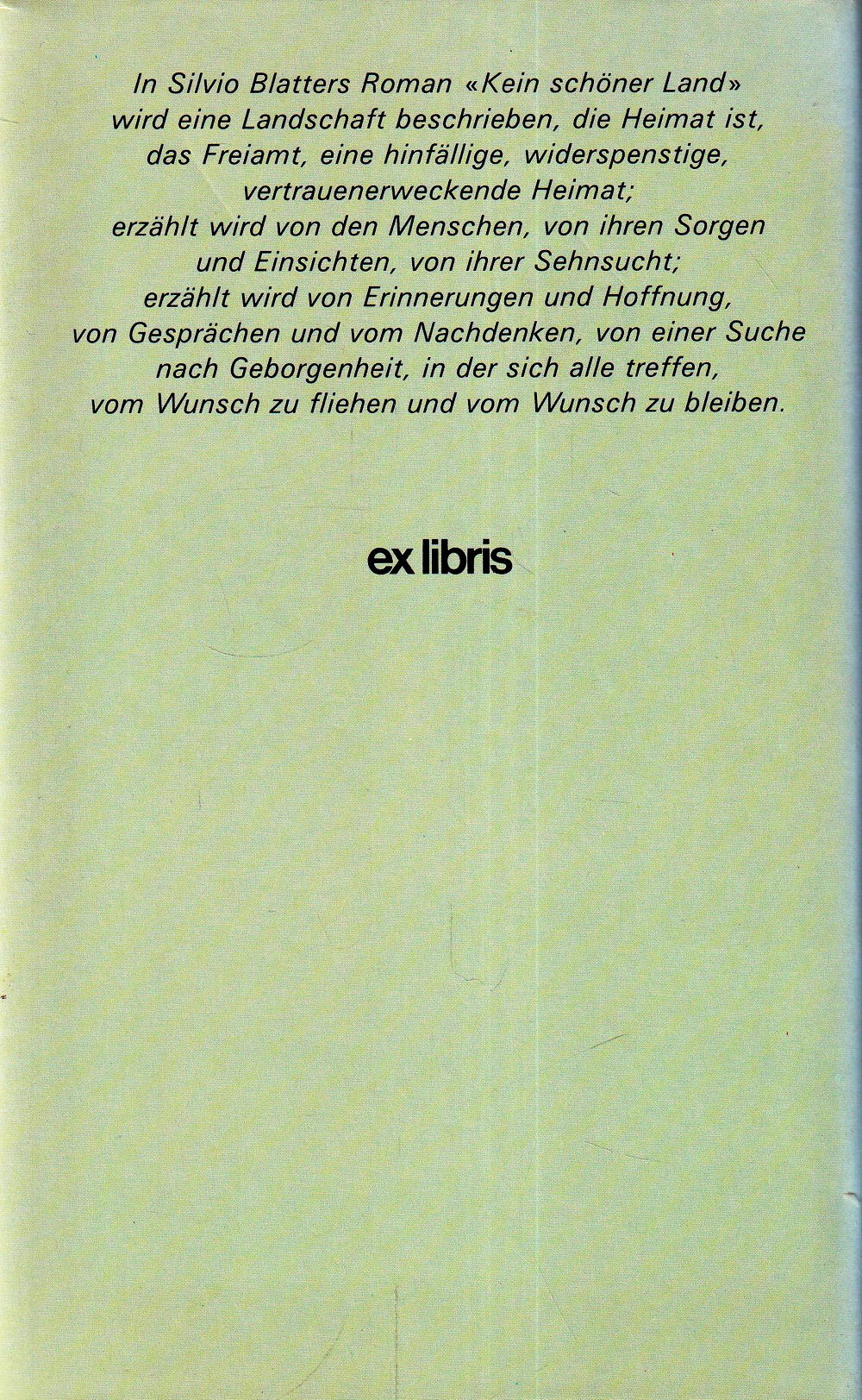 In Silvio Blatters Roman «Kein schöner Land» wird eine Landschaft beschrieben, die Heimat ist, das Freiamt, eine hinfällige, widerspenstige, vertrauenerweckende Heimat; erzählt wird von den Menschen, von ihren Sorgen und Einsichten, von ihrer Sehnsucht; erzählt wird von Erinnerungen und Hoffnung, von Gesprächen und vom Nachdenken, von einer Suche nach Geborgenheit, in der sich alle treffen, vom Wunsch zu fliehen und vom Wunsch zu bleiben.