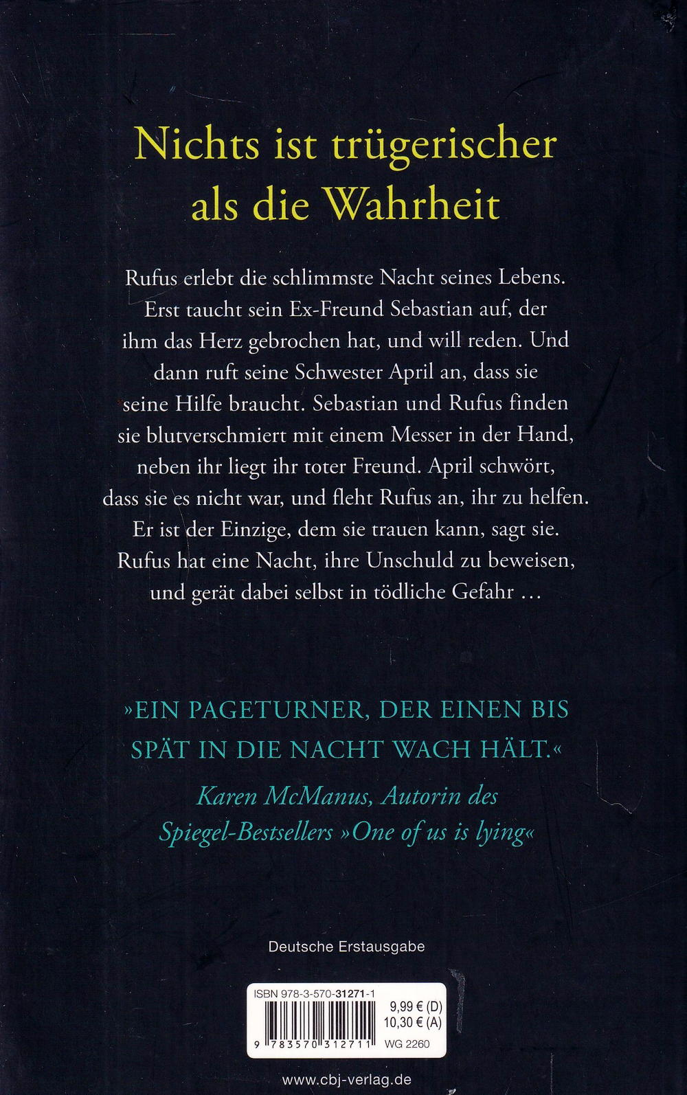 Rufus erlebt die schlimmste Nacht seines Lebens. Erst taucht sein Ex-Freund Sebastian auf, der ihm das Herz gebrochen hat, und will reden. Und dann ruft seine Schwester April an, dass sie seine Hilfe braucht. Sebastian und Rufus finden sie blutverschmiert mit einem Messer in der Hand, neben ihr liegt ihr toter Freund. April schwört, dass sie es nicht war, und fleht ihn an, ihr zu helfen. Rufus hat eine Nacht, ihre Unschuld zu beweisen, und gerät dabei selbst in tödliche Gefahr ...