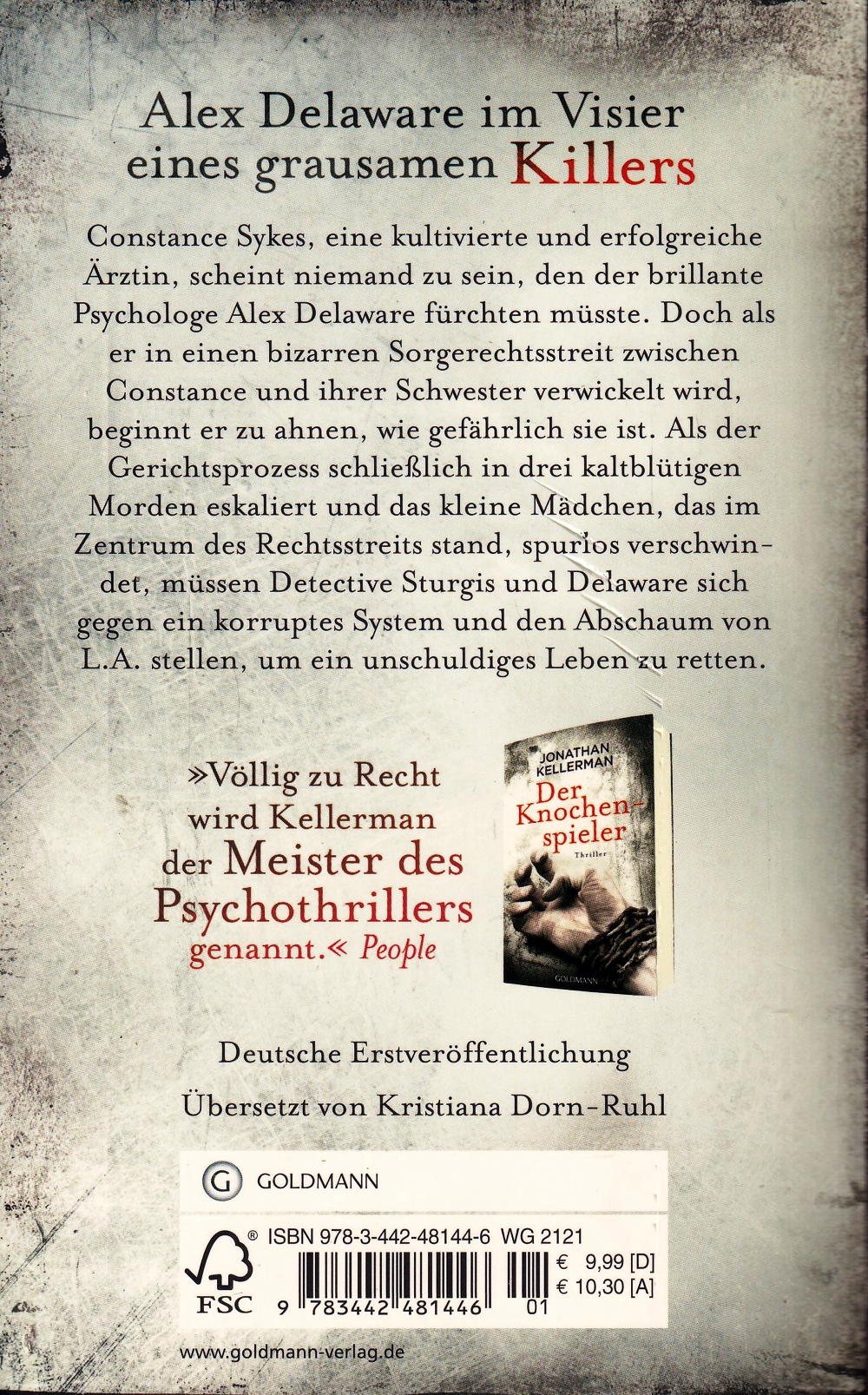 Der brillante Psychologe Alex Delaware hat Erfahrung mit dem kranken Geist. Dennoch scheint Constance Sykes, eine kultivierte und erfolgreiche Ärztin, niemand zu sein, den man fürchten müsste. Doch als Delaware in einen bizarren Sorgerechtsstreit zwischen Constance und ihrer Schwester verwickelt wird, beginnt er zu erahnen, wie gefährlich sie ist. Als der Gerichtsprozess schliesslich in einem kaltblütigen Mord eskaliert und das kleine Mädchen, das im Zentrum des Rechtsstreits stand, spurlos verschwindet, müssen Detective Sturgis und Delaware sich gegen ein korruptes System und den Abschaum von L.A. stellen, um ein unschuldiges Leben zu retten.