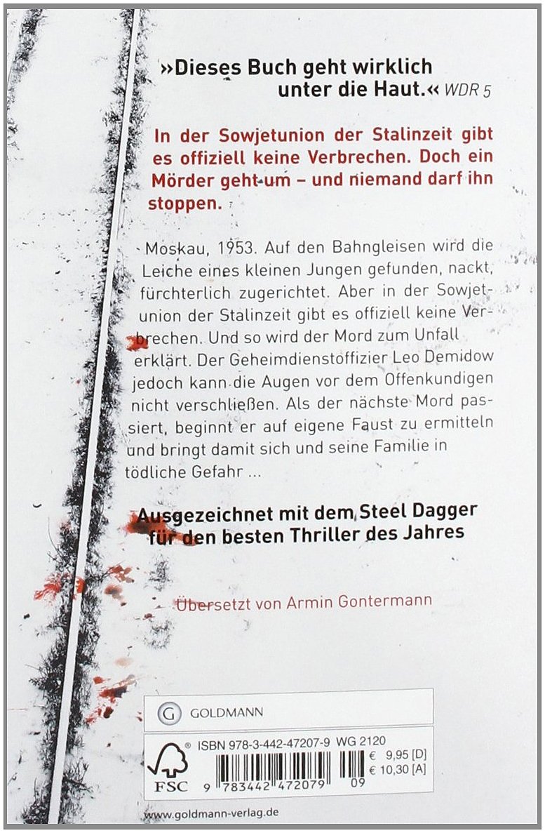 Moskau 1953. Auf den Bahngleisen wird die Leiche eines kleinen Jungen gefunden, nackt, fürchterlich zugerichtet. Doch in der Sowjetunion der Stalinzeit gibt es offiziell keine Verbrechen. Und so wird der Mord zum Unfall erklärt. Der Geheimdienstoffizier Leo Demidow jedoch kann die Augen vor dem Offenkundigen nicht verschließen. Als der nächste Mord passiert, beginnt er auf eigene Faust zu ermitteln und bringt damit sich und seine Familie in tödliche Gefahr …
