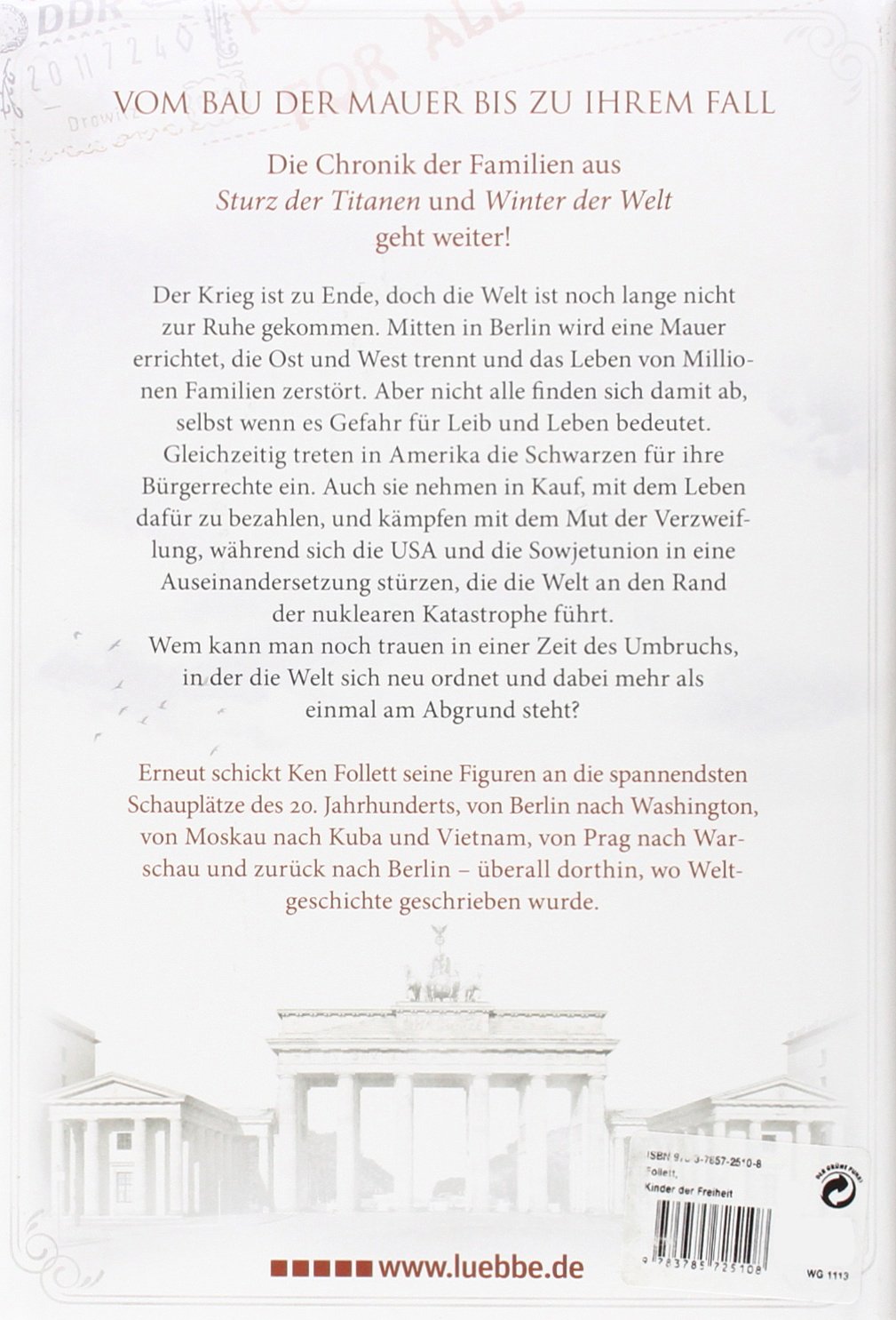 - 25 Jahre nach dem Fall der Mauer bringt Ken Follett, seine Jahrhundert-Trilogie, die mit STURZ DER TITANEN und WINTER DER WELT begann, zu einem packenden und furiosen Finale.