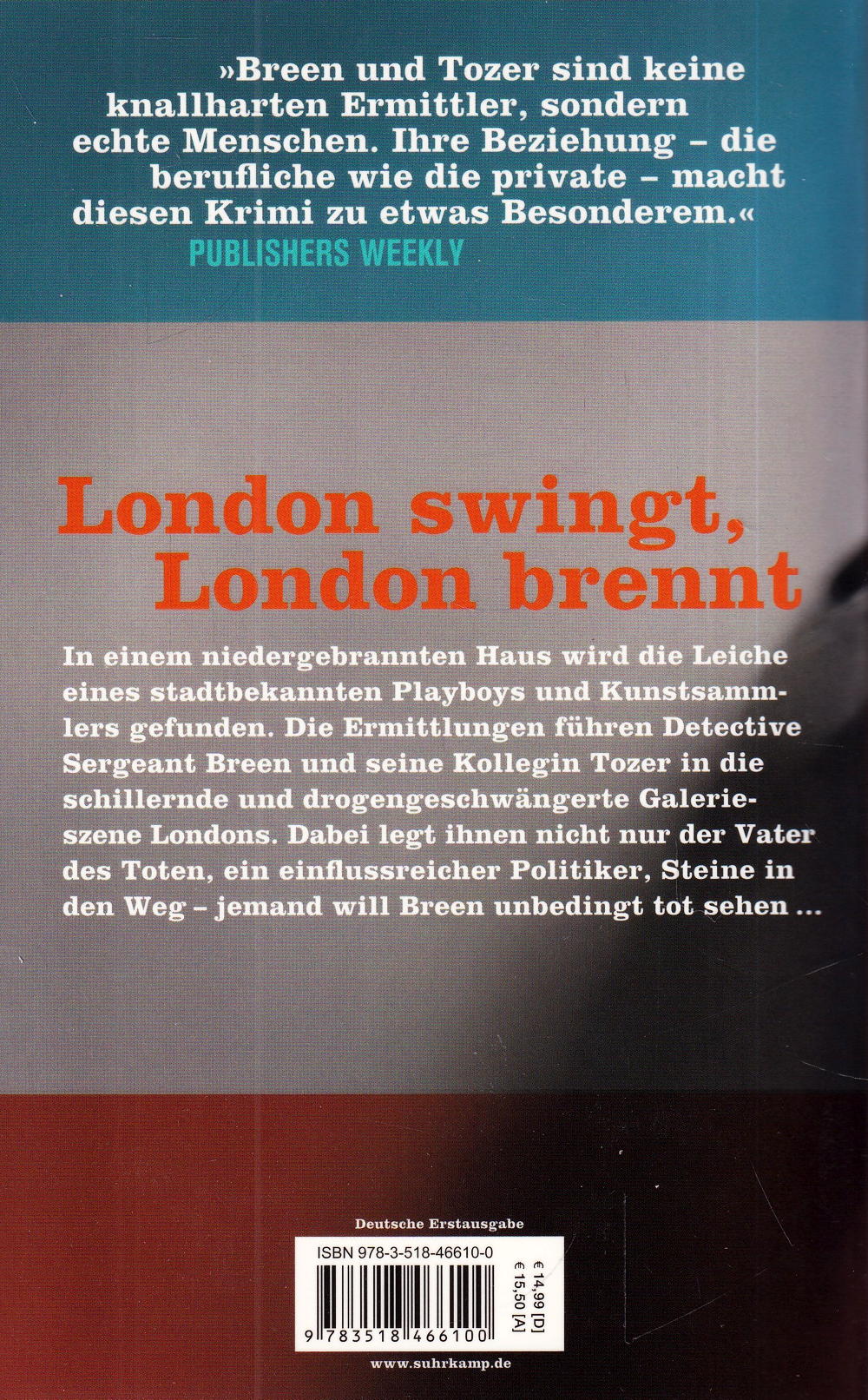 London, November 1968: Hippiekommunen besetzen Häuser, in der Royal Albert Hall feiern John Lennon und Yoko Ono "alchemistische Hochzeit", und in den Galerien hängen Bilder, die den Blick des Betrachters mächtig herausfordern. In diese so bunte wie nebulöse Welt gerät Detective Sergeant Breen, als in einem niedergebrannten Haus die Leiche eines jungen Mannes gefunden wird. Die Todesumstände sind mysteriös und der Tote nicht nur ein stadtbekannter Playboy und Kunstsammler, sondern auch Sohn eines angehenden Ministerpräsidenten. Und dieser tut so einiges, um Breen bei der Ermittlung Steine in den Weg zu legen. Das ist aber bei Weitem nicht Breens einziges Problem: Fast täglich erhält er Morddrohungen, und er wüsste endlich gern, woran er mit Tozer ist - bevor sie den Polizeidienst quittiert und die Stadt für immer verlässt.