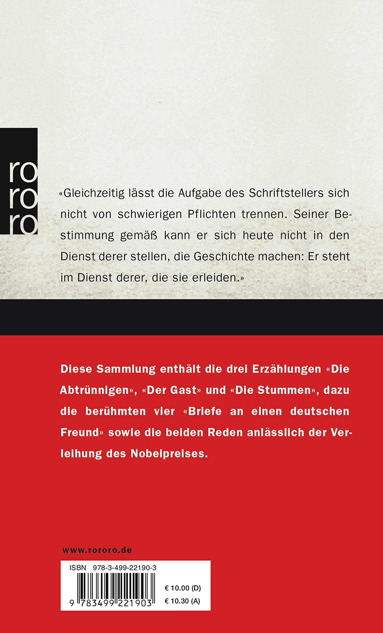 "Gleichzeitig lässt die Aufgabe des Schriftstellers sich nicht von schwierigen Pflichten trennen. Seiner Bestimmung gemäss kann er sich heute nicht in den Dienst jener stellen, die Geschichte machen: er steht im Dienst derer, die sie erleiden." Diese Sammlung enthält die drei Erzählungen "Die Abtrünnigen", "Der Gast" und "Die Stummen", dazu die berühmten vier "Briefe an einen deutschen Freund" sowie die beiden Reden anlässlich der Verleihung des Nobelpreises.