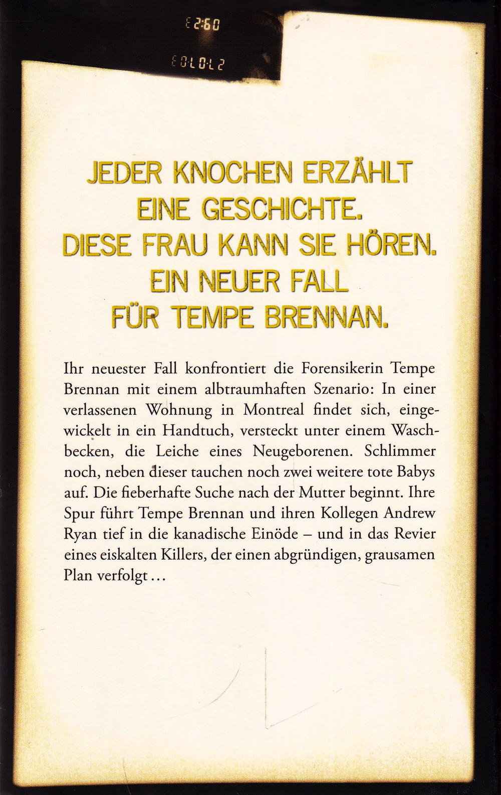 Ihr neuester Fall konfrontiert Tempe Brennan, forensische Anthropologin, mit einem albtraumhaften Szenario: In einer verlassenen Wohnung in Montreal findet sich, eingewickelt in ein Handtuch, versteckt unter einem Waschbecken, die Leiche eines Neugeborenen. Schlimmer noch: Neben diesem tauchen noch zwei weitere tote Babys auf. Die fieberhafte Suche nach der Mutter beginnt. Ist sie eine herzlose Mörderin, getrieben von ihren Dämonen? Auf der Flucht vor ihrem Zuhälter? Geriet sie zwischen die Fronten eines Drogenkriegs? Ihre Spur führt Tempe Brennan und ihren Kollegen Andrew Ryan tief in die kanadische Einöde - und in das Revier eines eiskalten Killers, der einen abgründigen, grausamen Plan verfolgt ...
